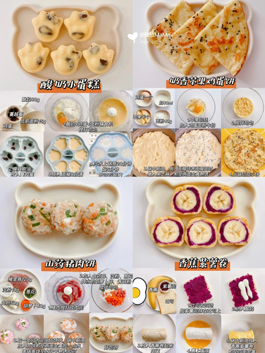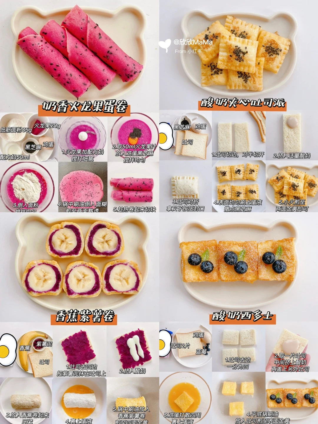 今天分享12款敲好吃的营养早餐,做法快手, 搭配米糊,牛奶就是健康的一餐啦! 妈妈们安排起来呀! ✅火龙果蛋卷 ✅早餐鸡蛋饼 ✅奶香紫薯酥 ✅酸奶夹心吐司派 ✅酸奶西多士 ✅西葫芦鲜虾饼 ✅西红柿鸡蛋饼 ✅山药鲜虾饼 ✅山药猪肉饼 ✅香蕉紫薯卷 ✅奶香苹果鸡蛋饼 ✅酸奶小蛋糕 🌟食材发小根据宝宝咀嚼能力来安排 🌟1岁以上宝宝可以加盐、酱油,一岁以下可以加点香菇粉、虾皮粉