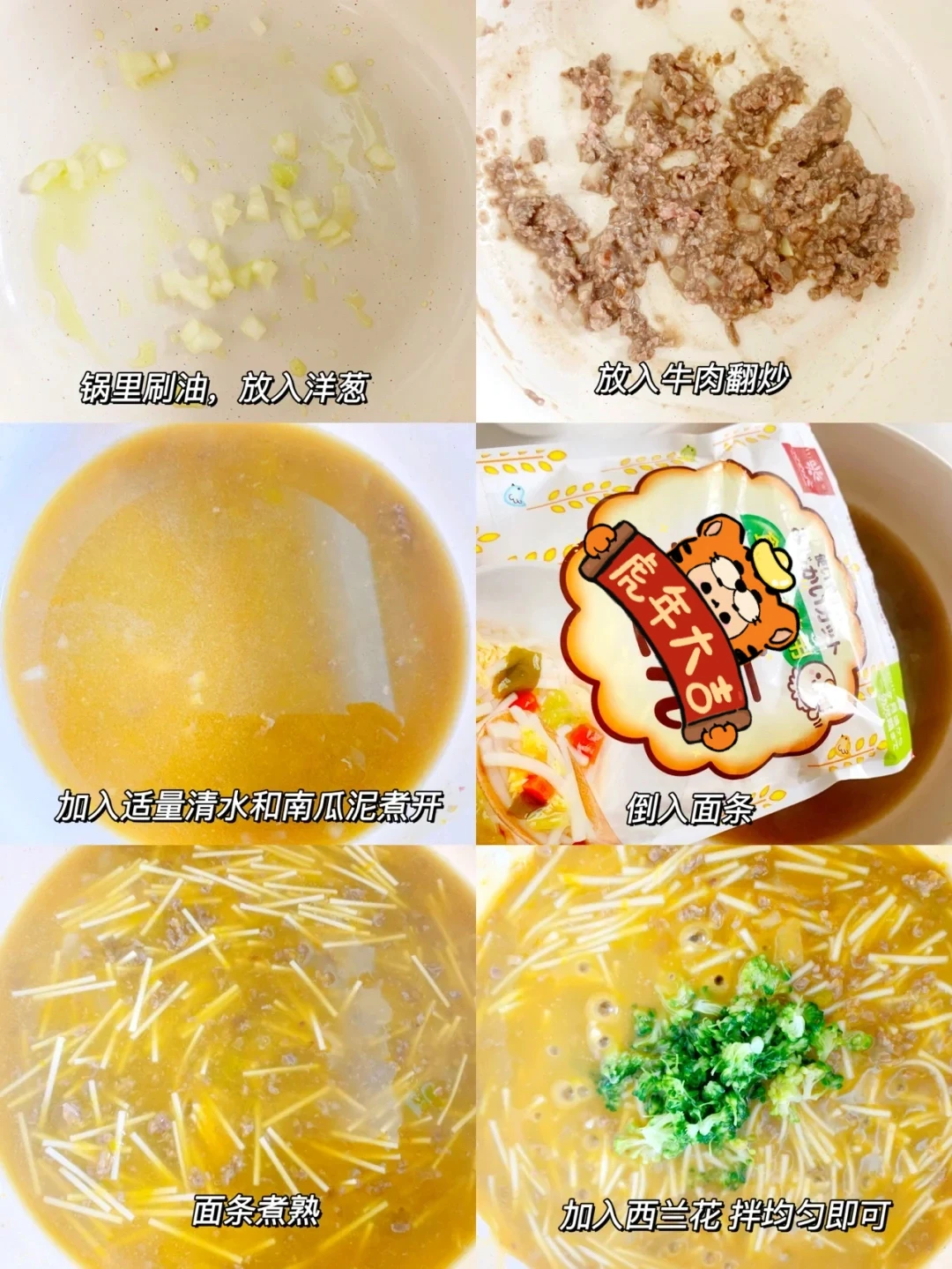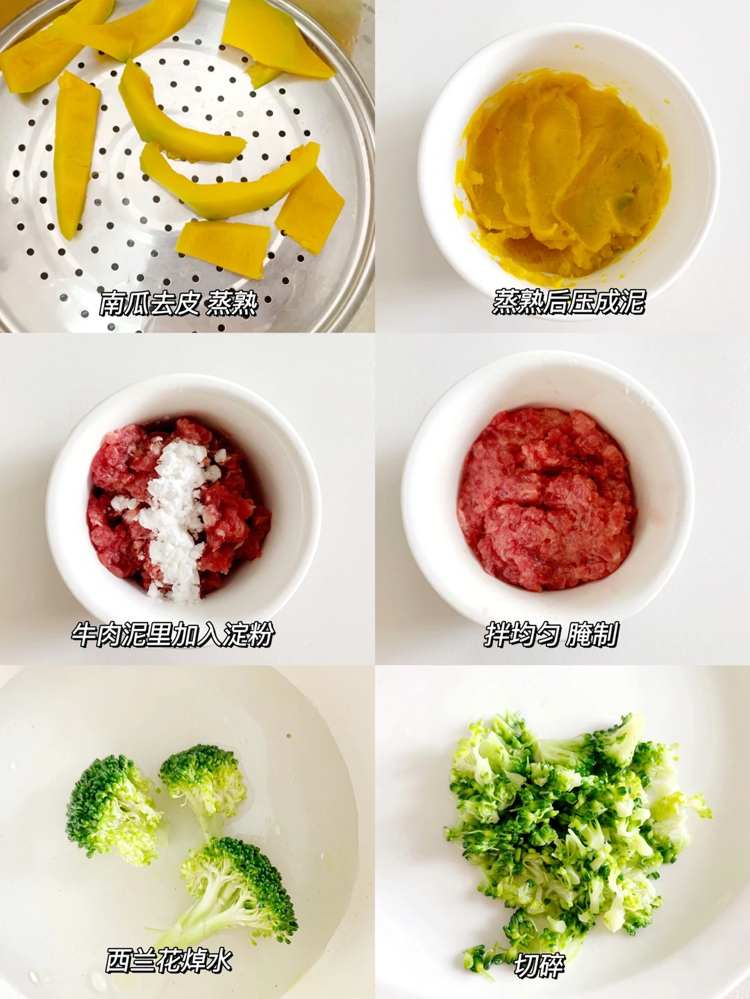 1⃣️南瓜去皮,蒸熟压成泥,牛肉沫加入淀粉,拌均匀腌制,西兰花焯水切碎