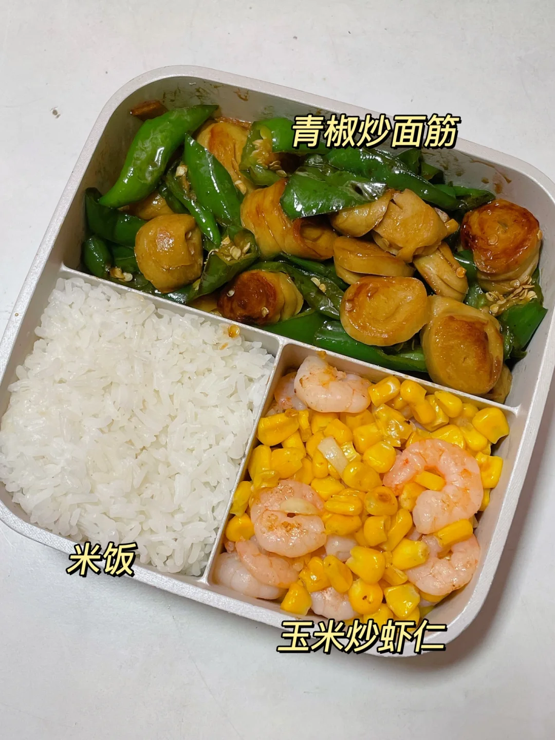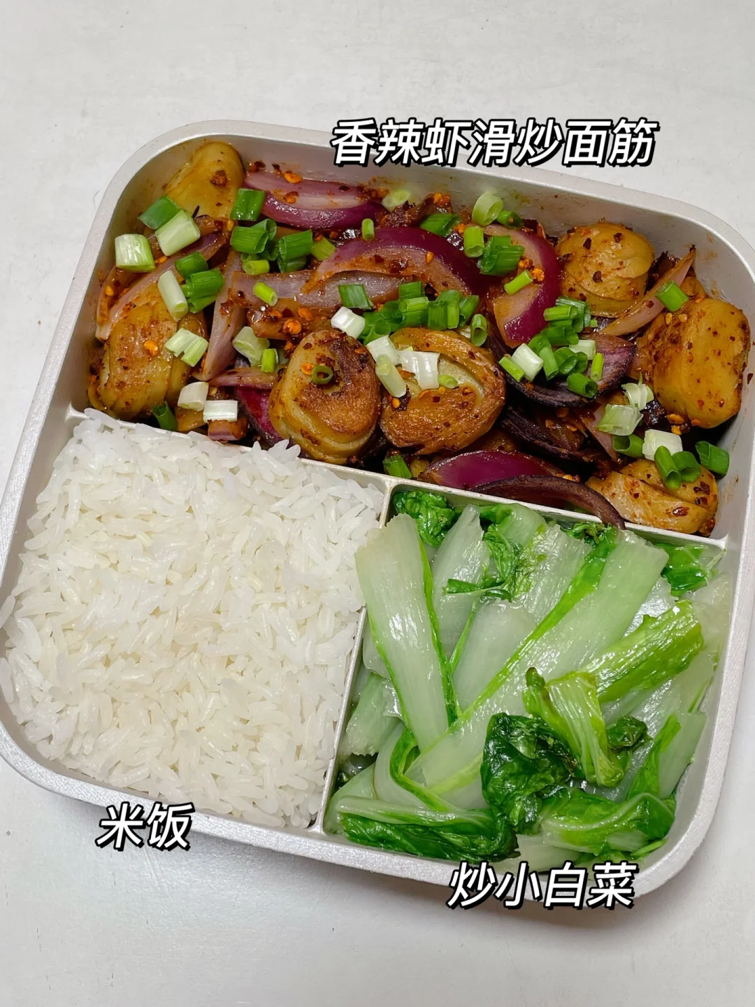 📍米饭+香辣虾滑炒面筋+炒小白菜