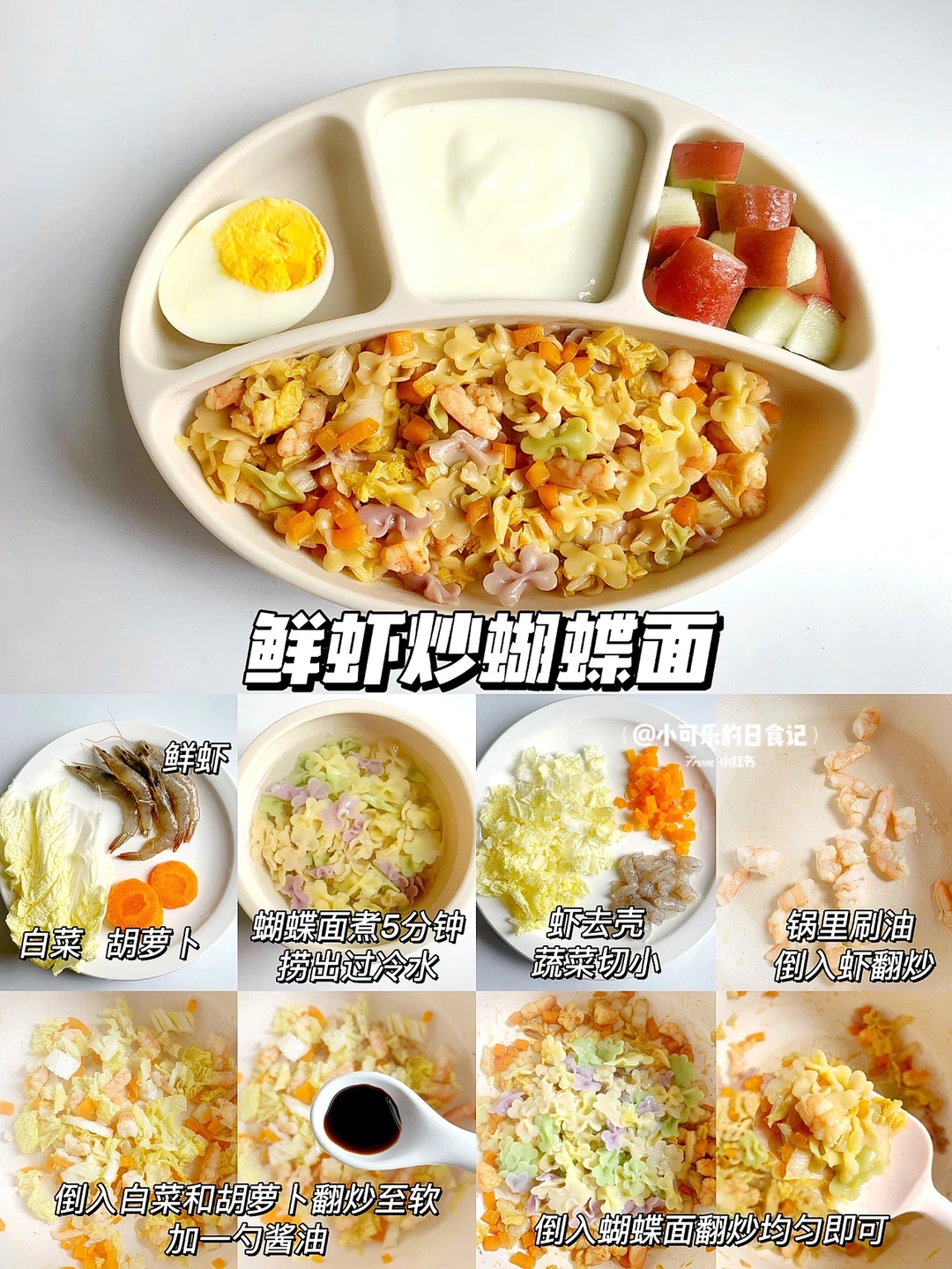 做法:1⃣️蝴蝶面煮5分钟捞出过冷水,虾去壳,蔬菜切小2⃣️锅里刷油,倒入虾翻炒,倒入胡萝卜和白菜翻炒至熟透,加一勺酱油,加入蝴蝶面翻炒均即可