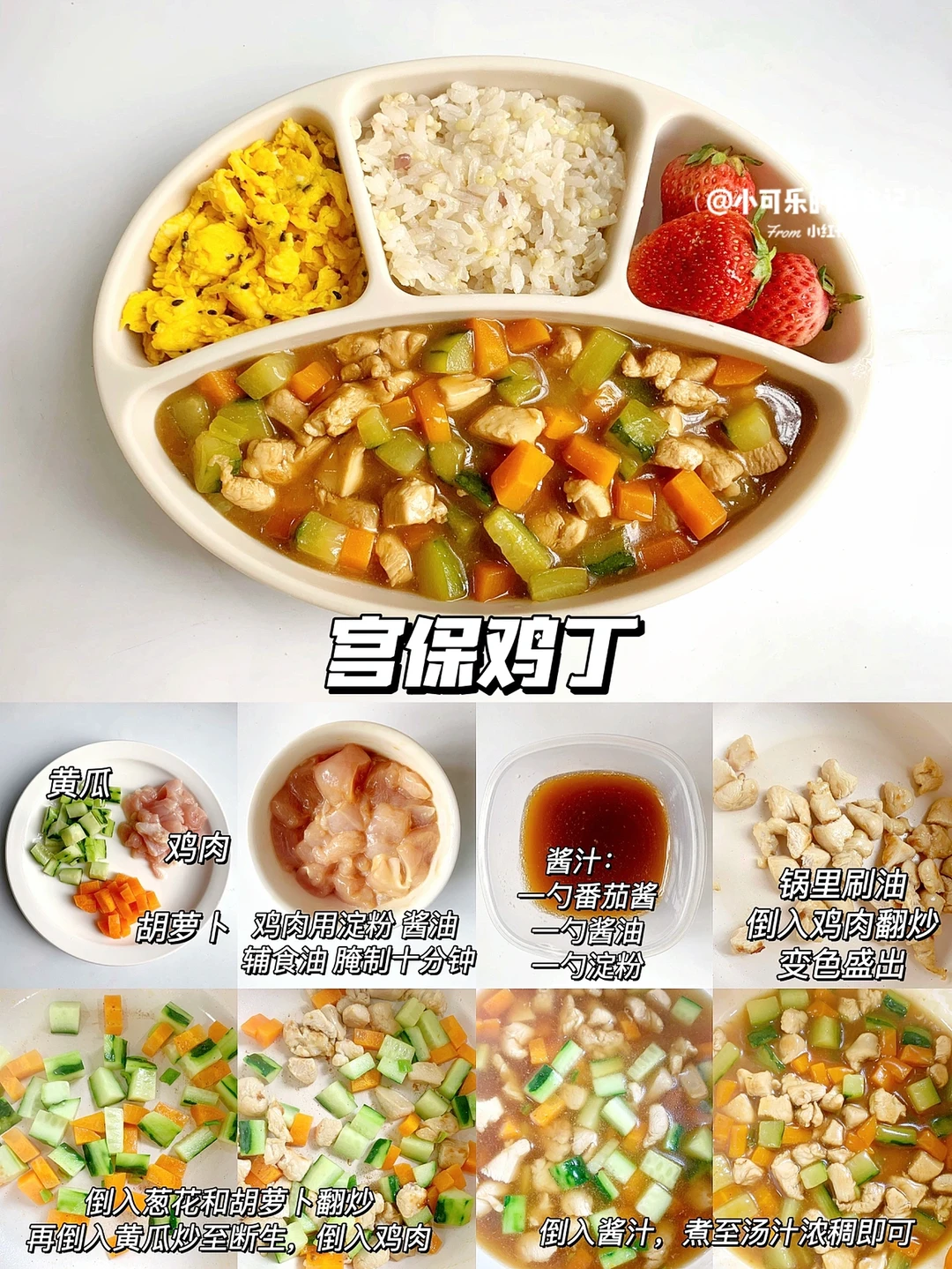 做法:1⃣️鸡肉用淀粉 酱油 辅食油腌制10分钟(酱汁:一勺番茄酱,一勺酱油、一勺淀粉,适量水)2⃣️锅里刷油,倒入鸡肉翻炒变色盛出3⃣️倒入葱花和胡萝卜翻炒,再倒入黄瓜炒至断生,倒入鸡肉,加入酱汁,煮至汤汁浓稠即可