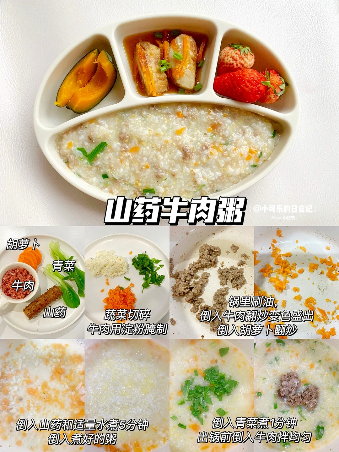 做法:1⃣️蔬菜切碎,牛肉用淀粉腌制2⃣️锅里刷油,倒入牛肉翻炒变色盛出3⃣️倒入胡萝卜翻炒,加入山药和适量水煮5分钟4⃣️加入煮好的粥和青菜煮1分钟,出锅前倒入牛肉拌均匀
