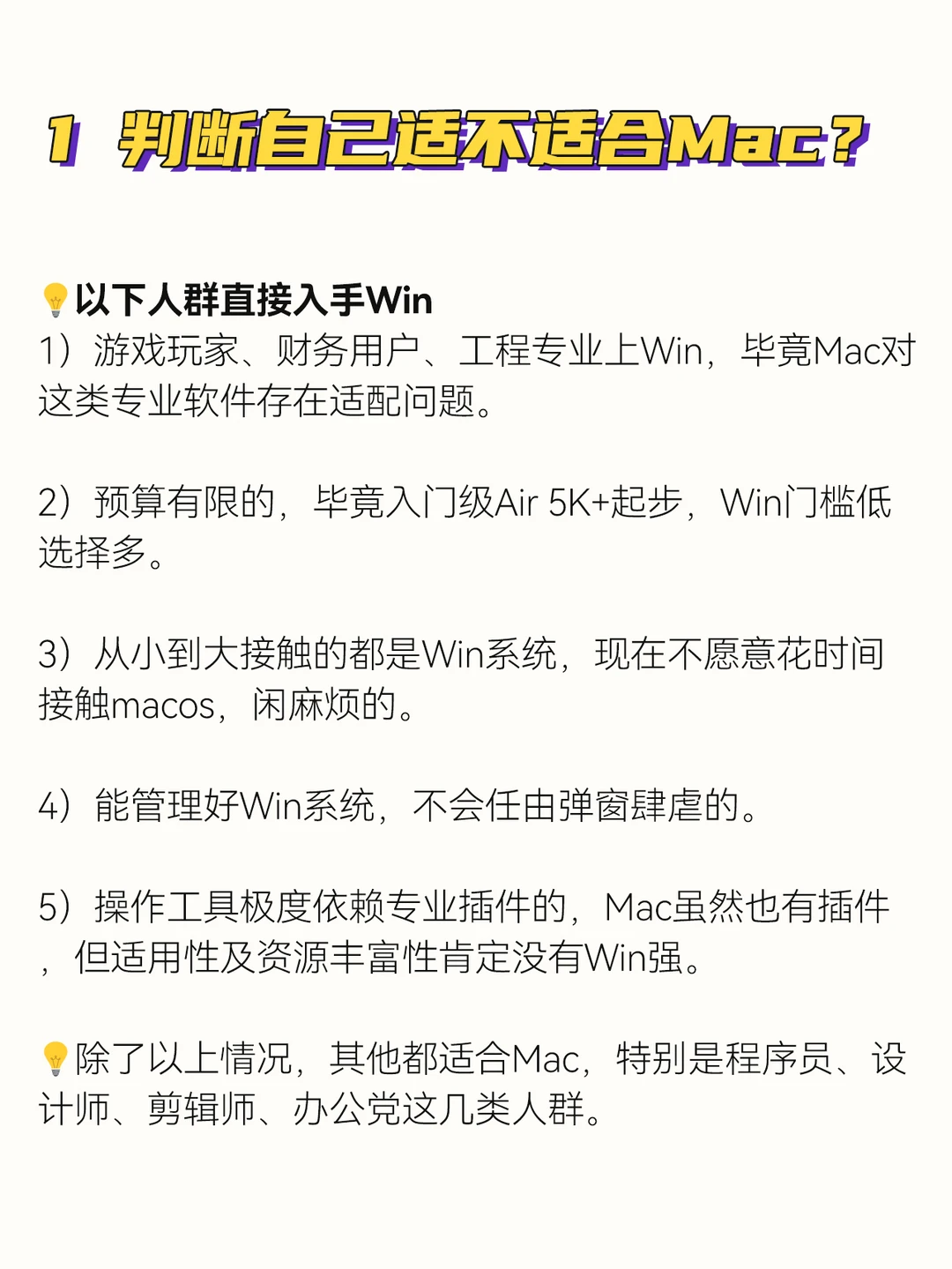 1)游戏玩家、财务用户、工程专业上Win,毕竟Mac对这类专业软件存在适配问题。