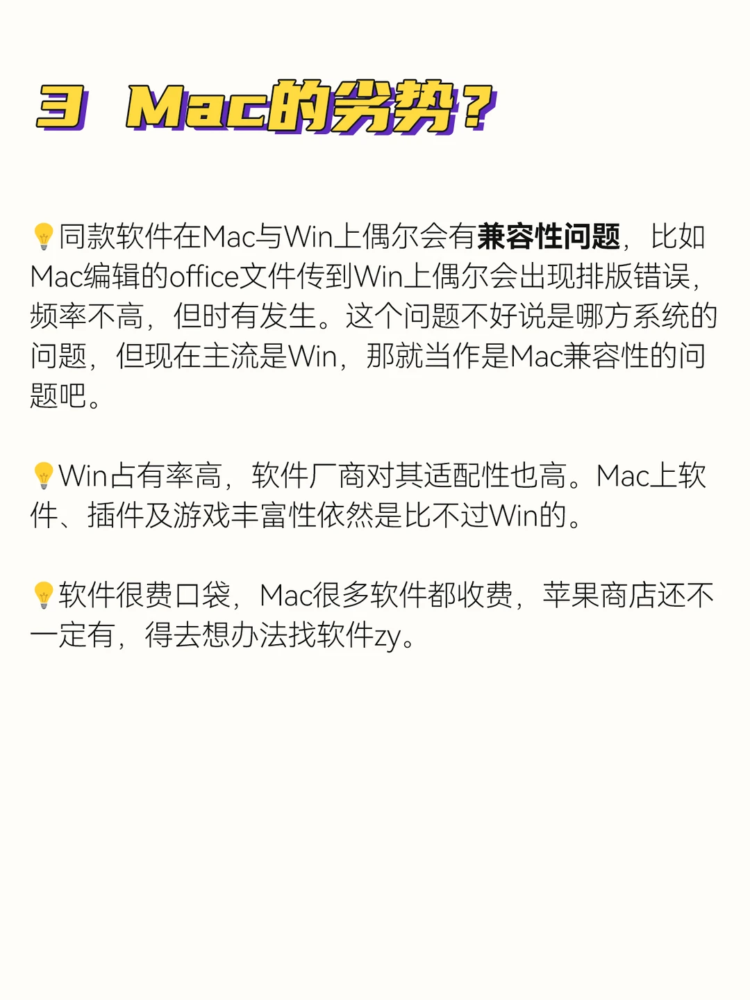1)同款软件在Mac与Win上偶尔会有兼容性问题,比如Mac编辑的office文件传到Win上偶尔会出现排版错误,频率不高,但时有发生。这个问题不好说是哪方系统的问题,但现在主流是Win,那就当作是Mac兼容性的问题吧。