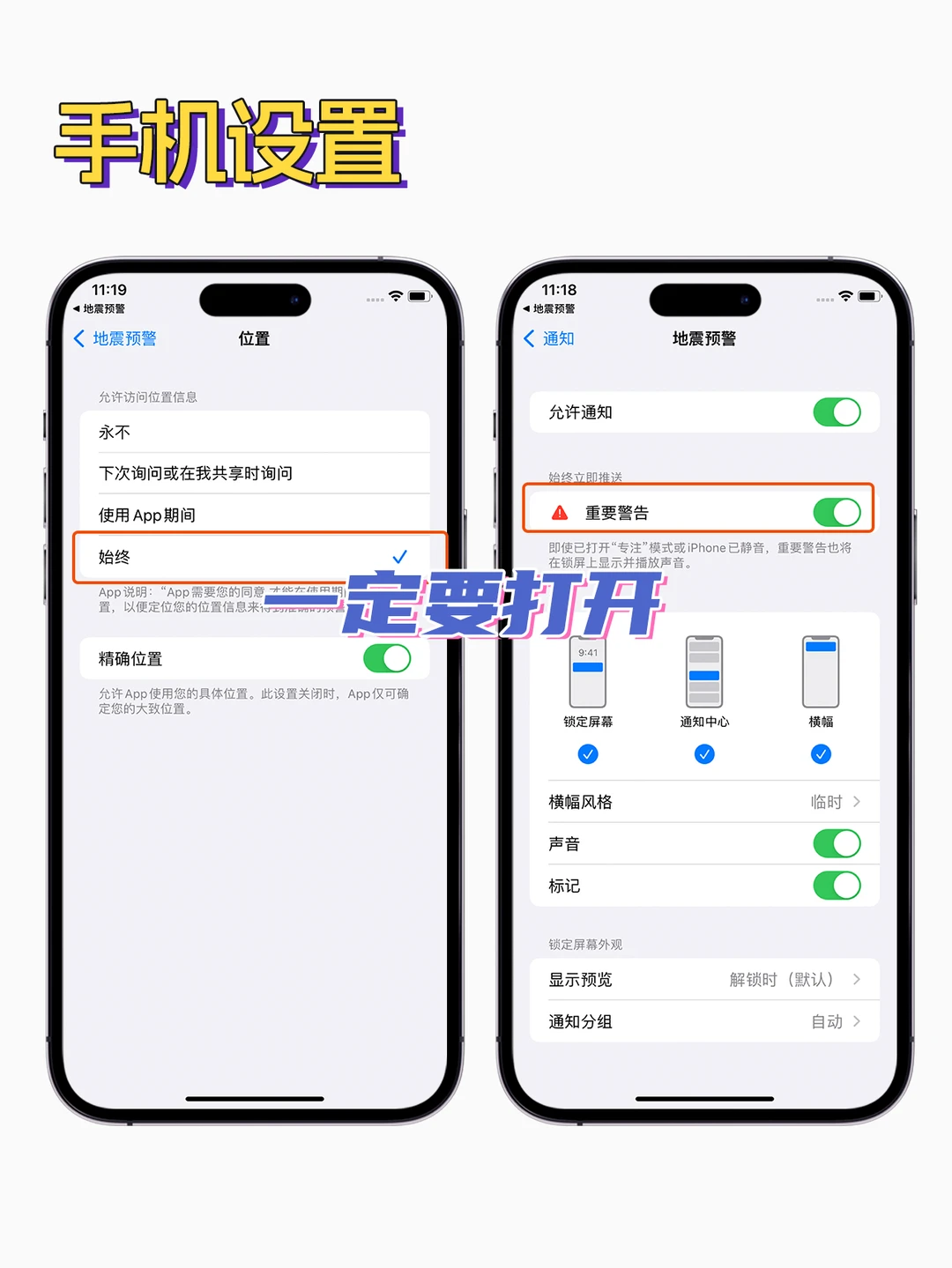 3️⃣打开手机系统【设置】-【地震预警】-【位置】-调整为【始终】