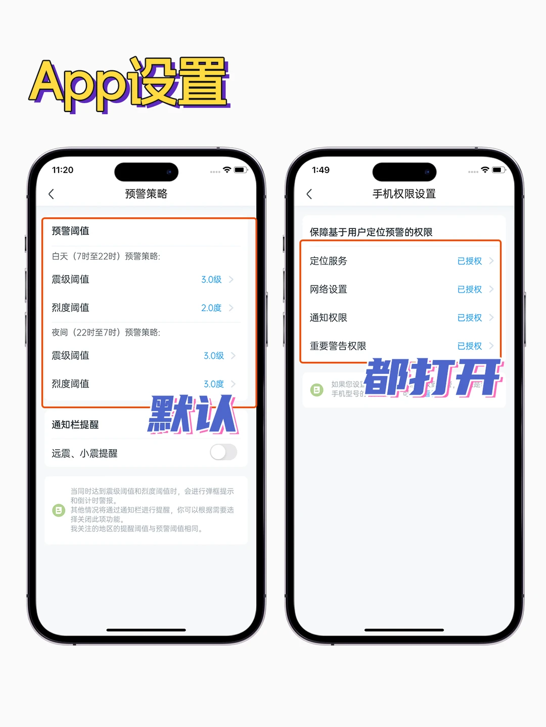 2️⃣进入地震预警app,【系统设置】的【预警策略】默认值即可;【手机权限设置】里的定位、网络、通知、重要警告全授权。