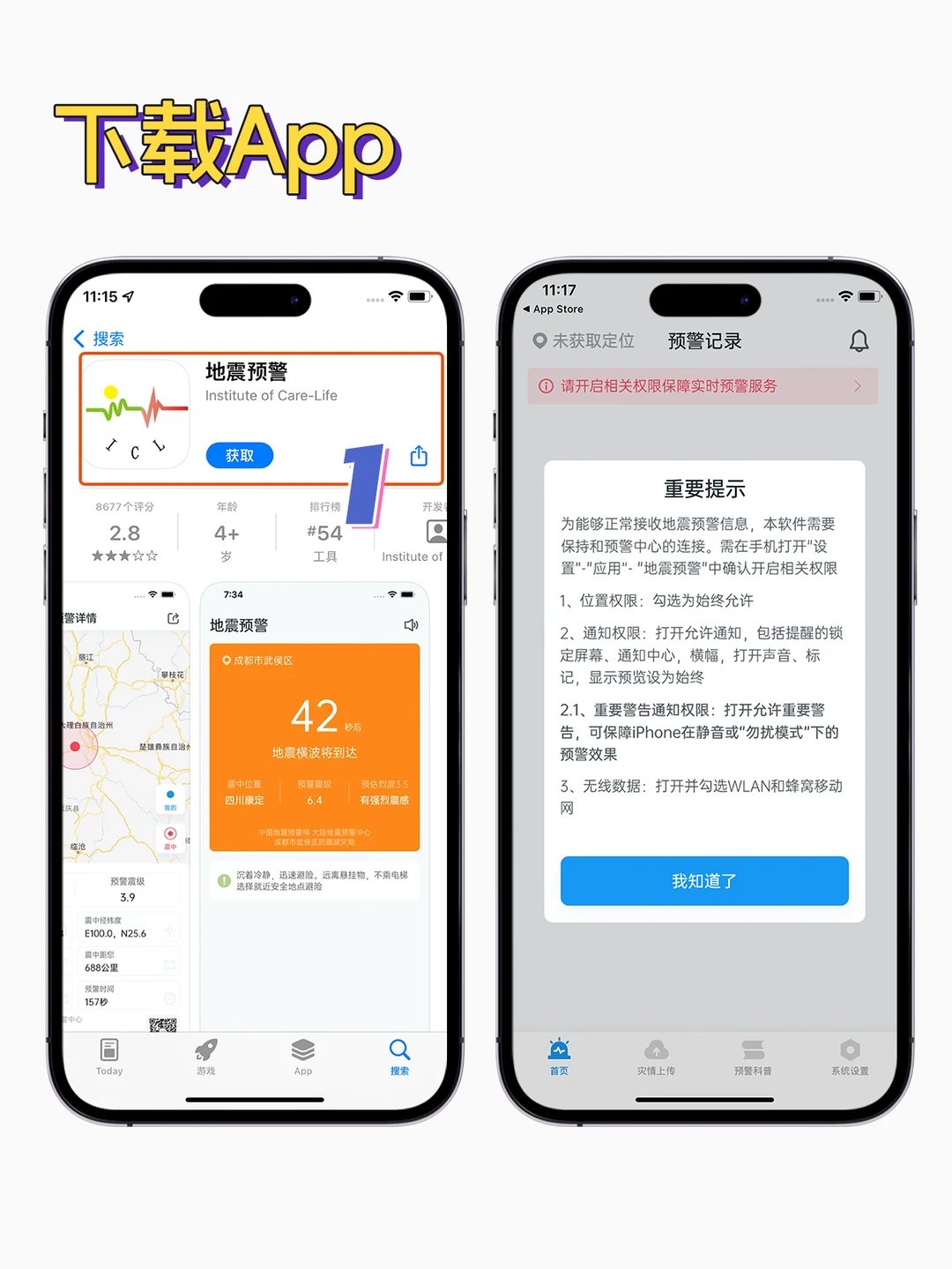 1️⃣app store下载“地震预警”app,成都高新减灾研究所研发的(可安心下载)
