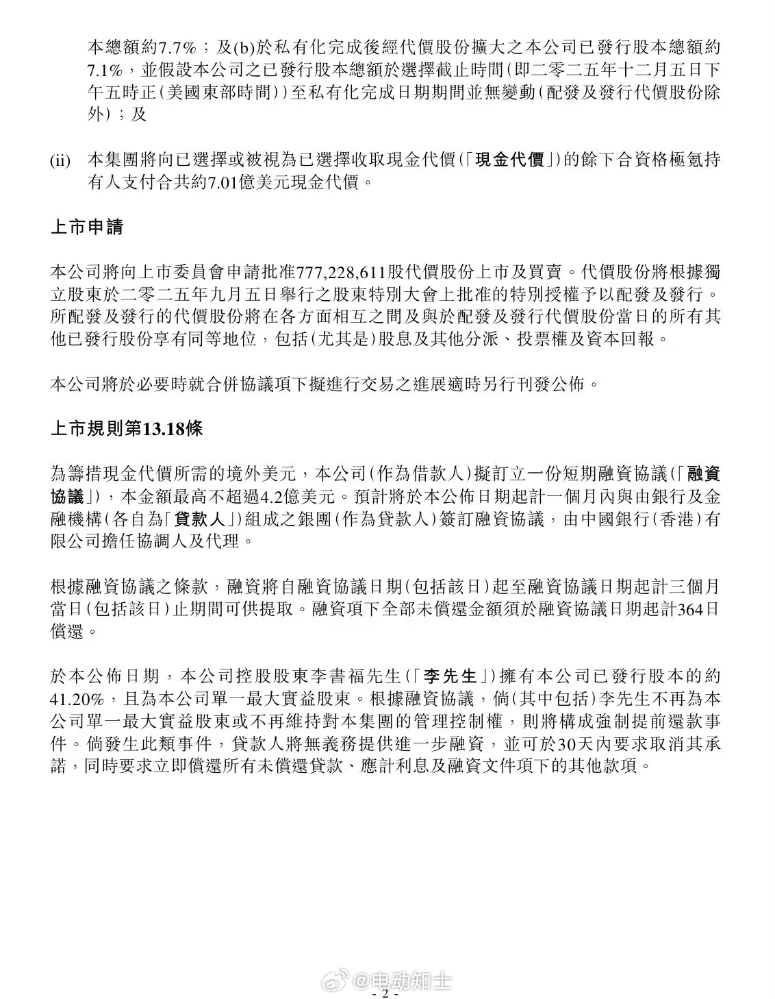 “一个吉利”计划终于要尘埃落定[喵喵] 吉利汽车控股有限公司发布公告,公布极氪智能科技控股有限公司私有化交易中持有人对价选择结果。 极氪持有人占合资格极氪持有人约70.8%,吉利汽车将为其配发及发行共计777,228,611股对价股份。 选择或被视为选择现金对价的极氪持有人,占合资格极氪持有人约29.2%,吉利汽车将支付合计约7.01亿美元现金。 根据规划,吉利汽车与极氪的合并交易于2025年12月29日或之前完成。