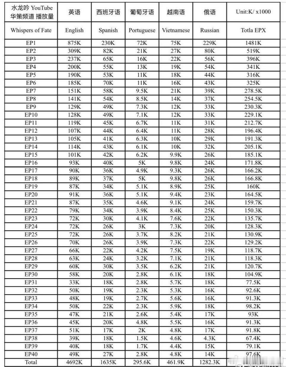 罗云熙《水龙吟》出海成绩亮眼,油管频道累计播放量达到837万。英语、西班牙语、俄语、越南语、印尼语、阿拉伯语6个语种的首集播放量,就已经超过了160万+!