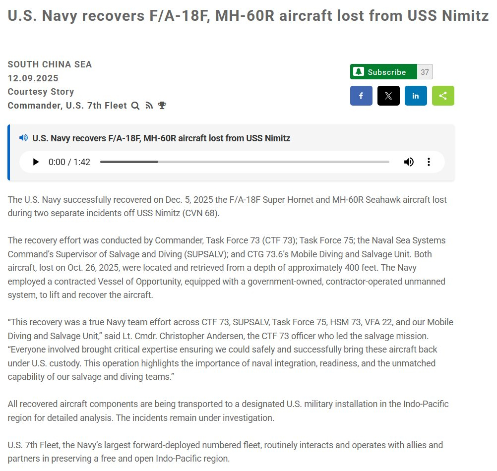 美海军成功打捞南海坠机——美国星条旗报报道,当地时间12月8号,美国海军表示,已经成功回收了尼米兹号航母(CVN-68)在10月26号坠入南海的两架战机,1架F/A-18F和1架MH-60R。美国海军表示,打捞队上周成功从南海约400英尺(约122米)水下找到并回收了坠机。烽火问鼎计划热点观点