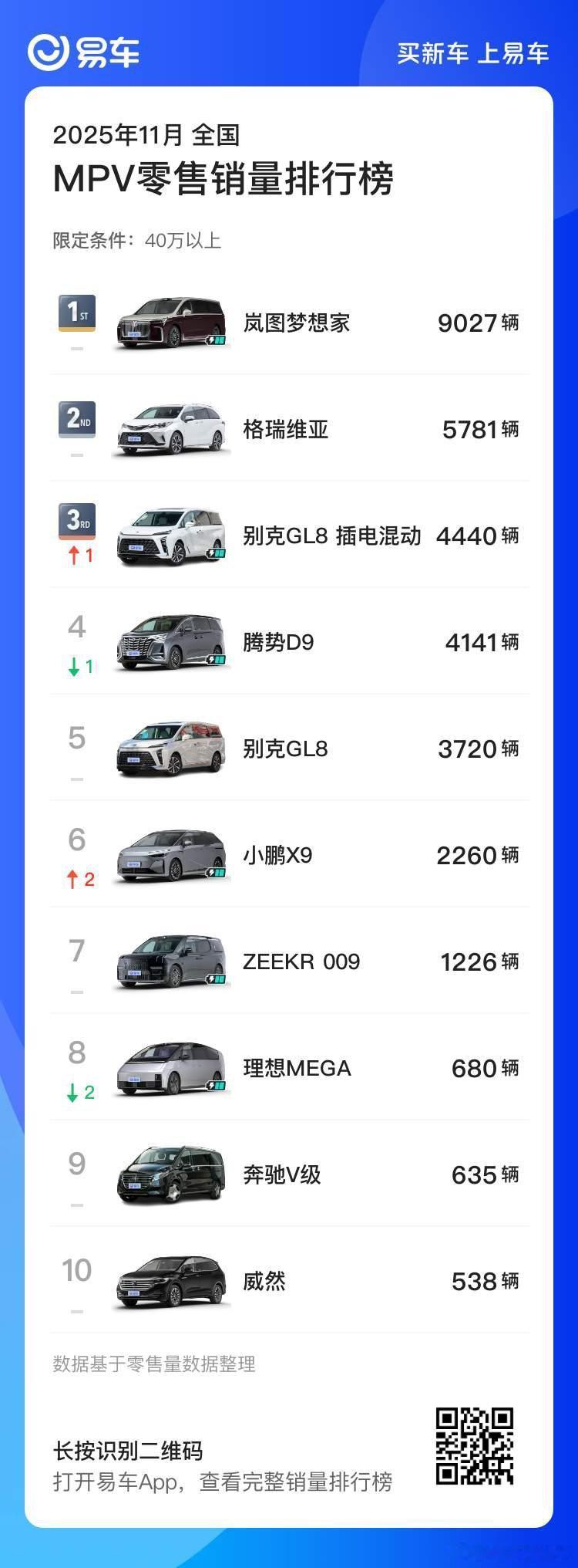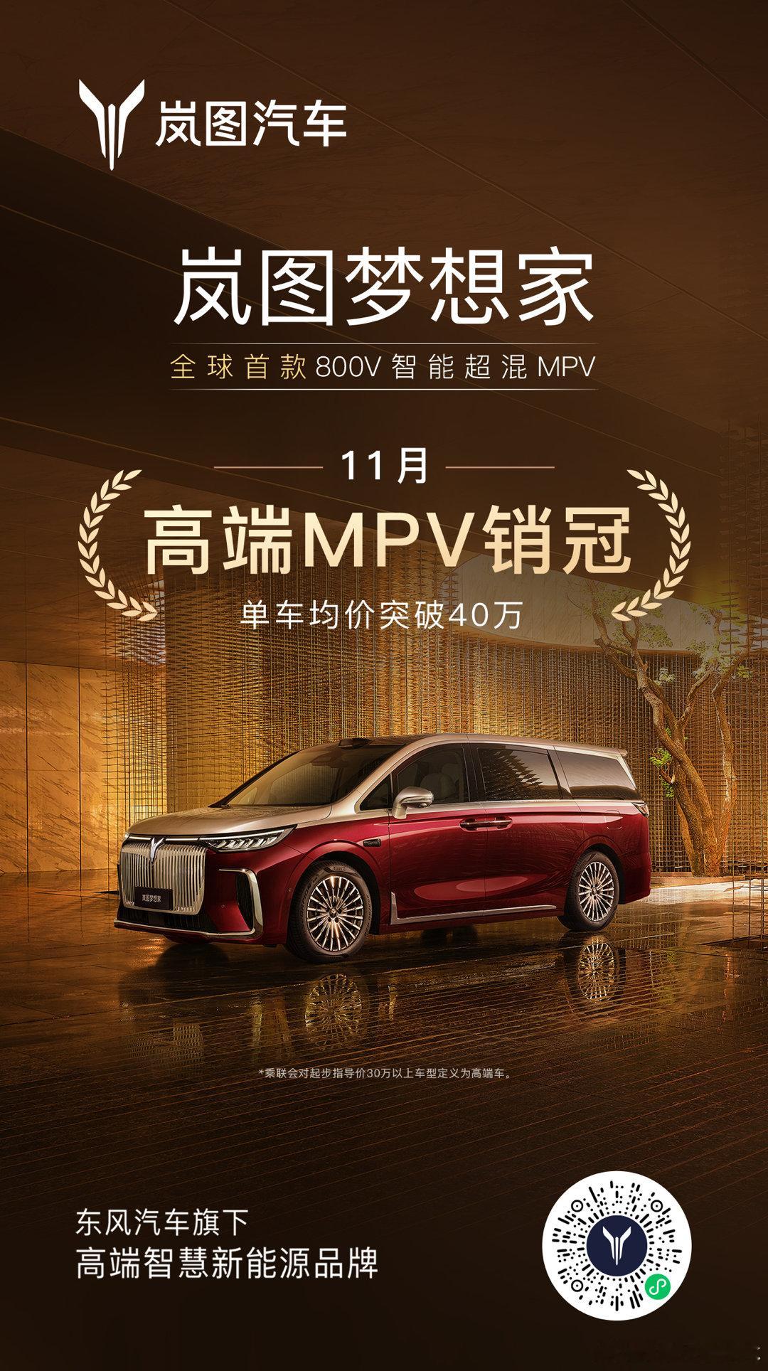 11月高端MPV销量排行发布11月榜单亮相:岚图梦想家再度登顶销冠,领先腾势D92达两倍!全球首款800V智能超混MPV身份加持,满足家庭与商务双重需求的“全能王”。先看价格诚意:2026款起步仅32.99万,就能配齐空气悬架、华为高阶智驾与全维安全防护,直接把同级逼到墙角。再看硬核实力:华为乾崑ADS 4搭配192线激光雷达,智能与安全双满格;350公里纯电续航覆盖日常通勤,亏电油耗仅5.26L,长途出行不焦虑;全铝底盘+空气悬架,配合±5°智能后轮转向,5.3米车身却拥有紧凑轿车级转弯半径;更有双SPA零重力座椅与三排加热,商务更体面,全家更舒适。难怪挑剔用户都把它列为首选,真·降维打击同级。岚图梦想家 高端MPV销冠 MPV推荐 腾势D9 别克GL8