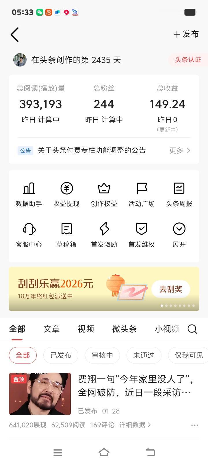 2024年10月8日,我咬牙报名了剪映带货课,一头扎进短视频洪流。快手、视频号、抖音,三大平台辗转,凌晨的剪辑框见过我,无人问津的三大平台也见证我。一年多了,学费还没挣回,梦却像隔了十万八千里。那些酸苦,只有自己知道。 2025年1月25日,我又转战头条,想靠AI写文章闯条新路。可两次违规,像两盆冷水,浇得人透心凉。没黑没白的敲打手机键盘,换来的收入却薄得像张纸。我不怕累,就怕累得不值。 所以2026年,我不贪心,只有一件事就是在網絡上能賺到錢,四大平臺分開說是两件事: 第一,短视频带货,我不强求“爆单王”的虚名,只求平台给点力,让洵哥的货真價實,童叟無欺、綱紅爆款好物、一直坚持用俺武警部隊的宗旨全心全意為人民服務來嚴格要求自已能被需要的人看见。讓这一年多的摸索、剪辑、坚持,能换来实实在在的訂單,把那一萬多的學費給掙回來,再有多一些的盈余那就更好了,對得起洵哥那些熬過的夜。 第二,今日头条极速版平台写文章,我不盼一夜暴富,只盼一分耕耘能有一分收获。愿每个认真写的字、每篇真诚的分享,都能被公平对待。违规的坑别再踩,流量的門微微開。每天一百二百,细水能長流,让我的思考与时间,能兑换成等值的尊严。 2026,不要大起大落,只要稳稳的回报。让努力看得見終點,让付出对得起汗水。这,就是洵哥最朴素的愿望。如果你也曾在奮斗路上感到失衡,点个赞,让我们一起,在2026年,把該赚的“銀子”賺回来!这就是2026年洵哥最想實現的一件事。