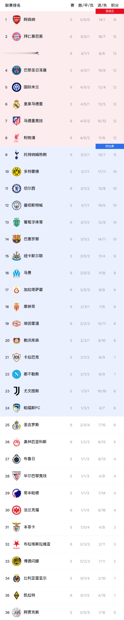 最新的积分榜上,阿森纳凭借全胜战绩稳居榜首,紧随其后的是拜仁慕尼黑,两队同积15分,但阿森纳凭借净胜球优势位列第一。积分榜前八名的球队目前为:阿森纳、拜仁、亚特兰大、巴黎、国米、皇马、马竞、利物浦。
