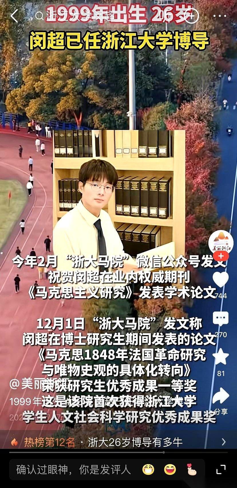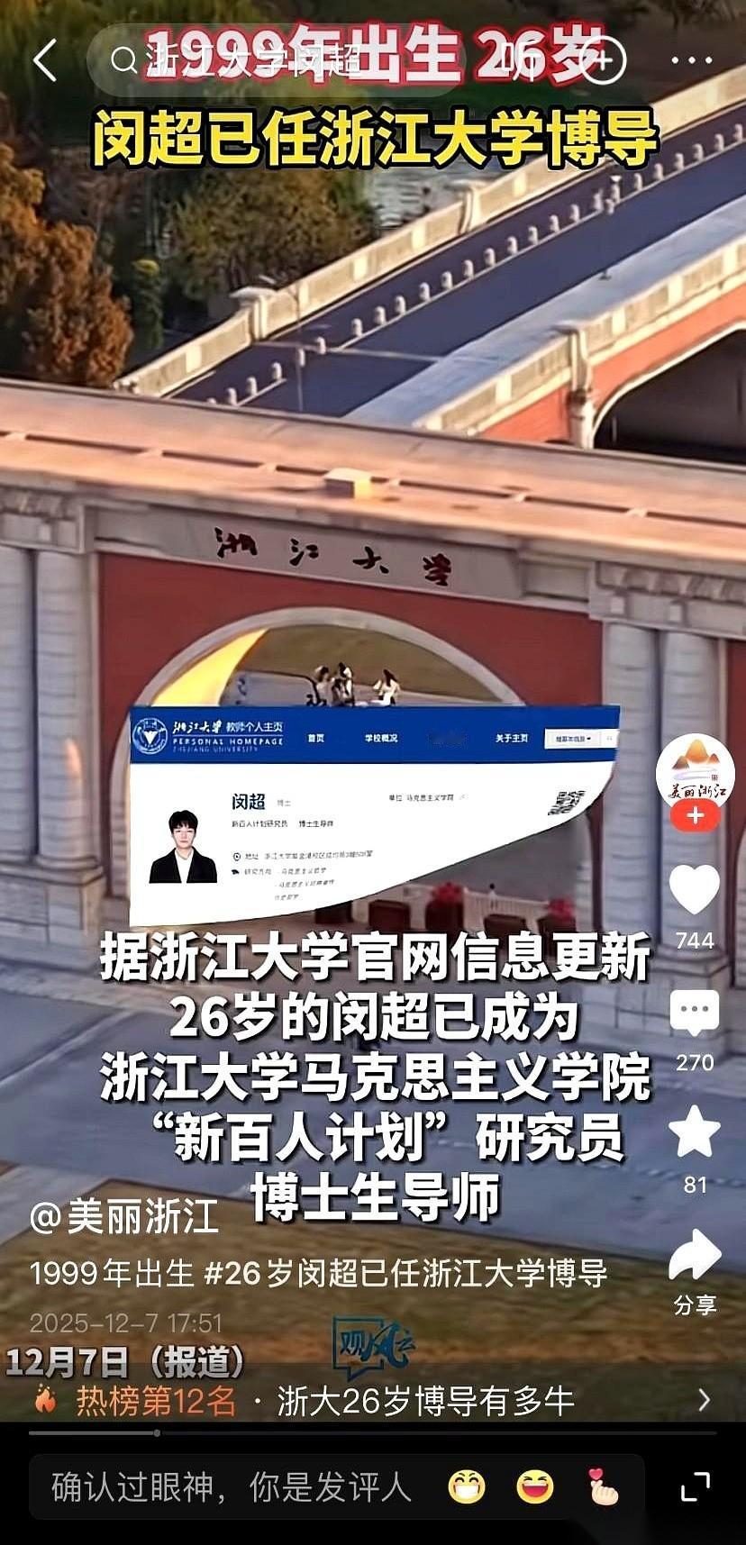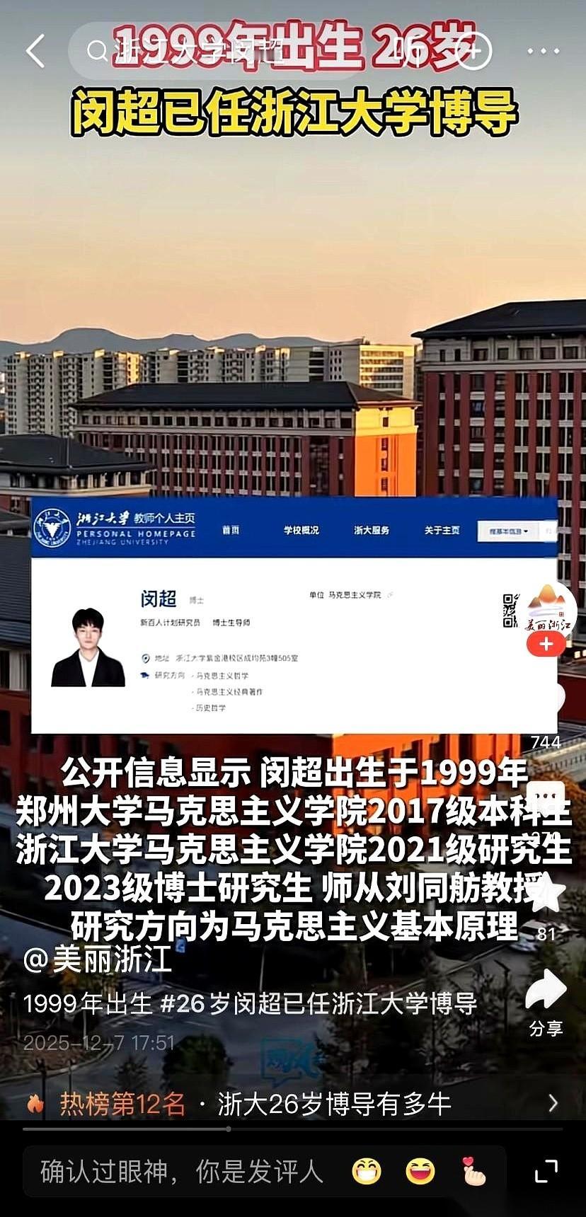 我滴个乖乖,99年的,浙大博导。 掰着指头算了半天,这是25岁?还是26岁? 反正我26岁的时候,还在发愁下个月的房租能不能凑齐。 人家已经是博士生导师了。 就是那种,你辛辛苦苦读完博士,想找他请教,还得尊称一声“老师”的那种。 这什么概念? 有些人还在人生的跑道上找位置、热身、绑鞋带,人家已经用百米冲刺的速度跑完了马拉松,顺便还当上了下一届的总教练。 而且,你注意看他的专业。 这背后代表的是什么?是一种信号,一种无比清晰、无比坚定的信号。 当大家还在卷计算机、卷金融的时候,真正的“顶层设计”和“底层逻辑”是什么,人家用职业选择给你拍脸上了。 这已经不是什么“后浪”了。 这是扑面而来的巨浪。 你不用去羡慕,更不用去嫉妒。 你只需要明白一件事:这个时代的变化,比我们想象的快得多,也深刻得多。 能把我们自己的思想和信仰,交给这么年轻的人去传承和发扬,这本身,就是一种强大到骨子里的自信。
