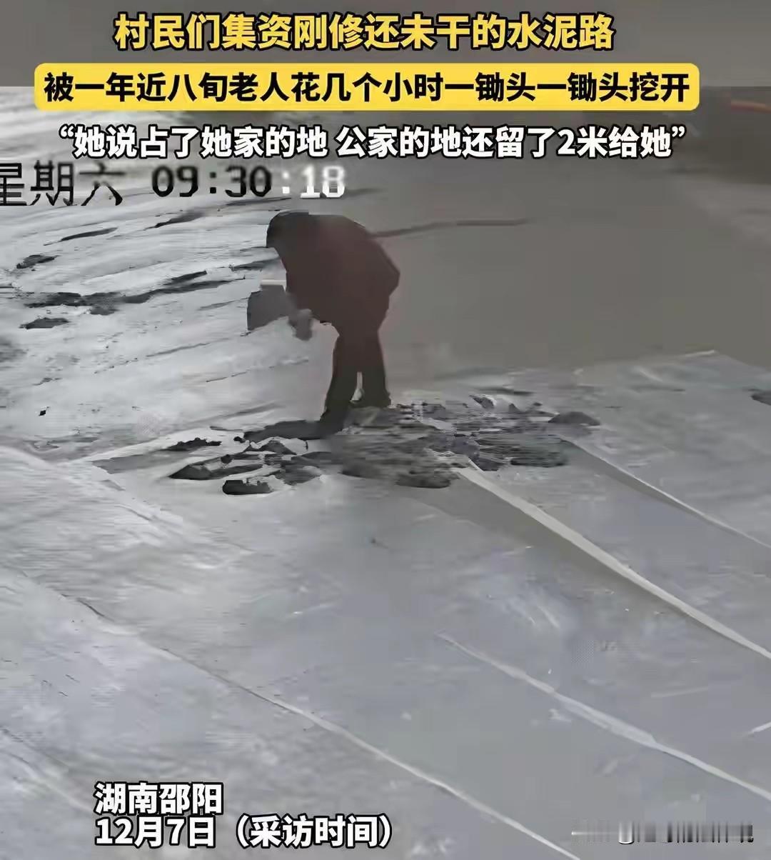 湖南邵阳,有一位村民自掏腰包,其他村民自愿集资,为全村修了一条路,没成想,水泥路还没干,一位80多岁的老人,拿着锄头将路面挖的坑坑洼洼,破坏了100多米。牵头修路的村民,无奈之下报了4次警,都没能阻止的了。村民:全村人的希望之路,被一个人毁了。 此事发生在邵阳新宁县的一个村庄。 村里原本是土路,晴天漫天灰尘,下雨遍地泥泞,村民出行不便。 李先生自掏腰包,组织村民想把村里的土路换成水泥路,方便村民日常出行。 李先生的善举得到了全村人的赞成,人们有钱的出钱,有力的出力。 很快备齐了材料,请了修路的工人,并开始动工。 12月6日,那段路铺设了水泥,基本上已经完工,工人也撤了。 所有村民,都盼着能早点投入使用。 然而谁也没想到,路刚铺成,水泥还没干。 一位80多岁的老太太,手里拿了一把锄头,把一片刚修好的路,刨的坑坑洼洼,挖了整整几个小时才罢休。 有人上前劝阻,有人拍视频,有人报了警。 而老太太仍然我行我素,谁劝给谁急,扬言:这是我家的地盘。 从视频画面可以看出,水泥路上,一位老人手持锄头,身边都是散乱的水泥块儿。 有村民反映称,老人认为修路占了她家的地,是村里人欺负她。 牵头修路的李先生称,当初规划的时候,已经考虑了这一块。 那一段路是公家的,还给老人家门前留了2米多的土地。 且老人并不住在那里,那里是她家的老屋,她住在新房子里。 李先生称,自己掏钱组织村民集资修路,是为了全体村民考虑并无私心。 村民们也都积极响应,有低保户都凑了50块钱,在外打工的村民有拿500的,有拿1000的,还有拿更多的。 有的学生拿出自己省下的200元,为的就是能让回村的路更好走,下雨天不再弄一身泥。 没想到,路刚修好,却遭到人为的故意破坏,李先生又痛心又气愤。 李先生称,被老人用锄头破坏的那一段有100多米。 为了不让老人破坏的更多路面,李先生一上午报了4次警。 可民警来了,老太太就停下,走了接着拿锄头开挖。 李先生认为,他和老人曾有过矛盾,相处的关系不是很好。 他觉得老人这么做,可能并不是单纯的因为占地的事,有可能是出于个人恩怨而报复。 村民们对刚修好的村路,被挖的一片狼藉,也都十分无奈。 对这样的老人谁也没办法,说不得嚷不得,还怕她到时候往地下一躺被讹上。 路修的好好的,突然被老人来这么一出,这事到底该咋办,村民心里也没底。 老人不但不赔偿损失,还说谁再和她过不去,就和谁拼命,修一次挖一次。 修路的事一时陷入了僵局,不得不停工停产。 村民们多年的心愿,本来就快要实现了,没想到再次令人失望。 据悉,村民们去年就商量着想把路修好,就是因为这个老人的反对而没修成。 今年由李先生牵头,并自掏腰包修路,本是件好事,事至今日路是修成了。 可老人偏偏把100多米的新路给故意破坏,来发泄自己的不满,难道老人就可以为所欲为? 据村民称,其实这位老人不住在距离修路很近的老房子里。 她自认为,自己基本上用不到这段路,所以才敢把路毁掉。 村里的干部虽然做了不少工作,但收效不大。 该村一村干部还原了事件的更多细节。 村干部称,李先生与破坏路的老人,其实是亲戚关系。 她之所以把修好的路挖烂,主要原因是两家长期存在矛盾。 涉事老人不愿领对方修路的这份人情,这才把一段水泥路给挖开了。 老人破坏的路段,也只是他自家门前的那段路。 老人的行为确实冲动,但她认死理儿没人劝得了。 可那一片片被挖烂的水泥,像根刺一样扎在村民们的心里。 修桥补路,本来是积德行善造福村民,可咋就成了这样一堆烂摊子呢? 《刑法》第275条:故意毁坏公私财物,数额较大或者有其他严重情节的,处3年以下有期徒刑、拘役或者罚金。 村民集资修建的道路,属于集体公共财产,老人持锄头破坏100多米水泥路。 若道路修复费用较高,达到数额较大标准,或具有破坏公共设施、造成较大社会影响等其他严重情节,则构成故意毁坏财物罪。 修路是造福全村的好事,老人因个人原因破坏公共财物,损害了集体利益,若情节严重应受到刑事处罚。 《治安管理处罚法》第49条:盗窃、诈骗、哄抢、抢夺、敲诈勒索或者故意损毁公私财物的,处5日以上10以下拘留,可以并处500元以下罚款; 情节较重的,处10日以上15日以下拘留,可以并处1000元以下罚款。 若老人的破坏行为情节较轻,未达到刑法规定的犯罪标准,公安机关可依据该条款对其进行行政处罚。 虽然老人已80多岁,不执行行政拘留,但仍可对其处以罚款。 这意味着,即使是老人,也不能随意破坏公共财物,否则需为自己的行为承担相应责任。 事情反映到了镇上,工作人员回应称,目前已经开始调查。 需要明确老人破坏的地段,是属于村里的,还是属于私人用地。 只有明确之后,才能采取不同的处置方式。