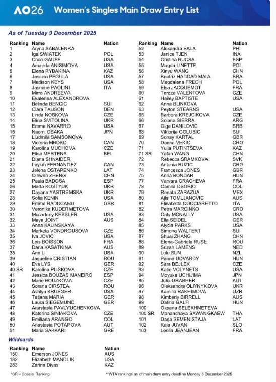 2026澳网男女单正赛公布直接入围名单,7位中国选手在列的有: 女单:郑钦文、王