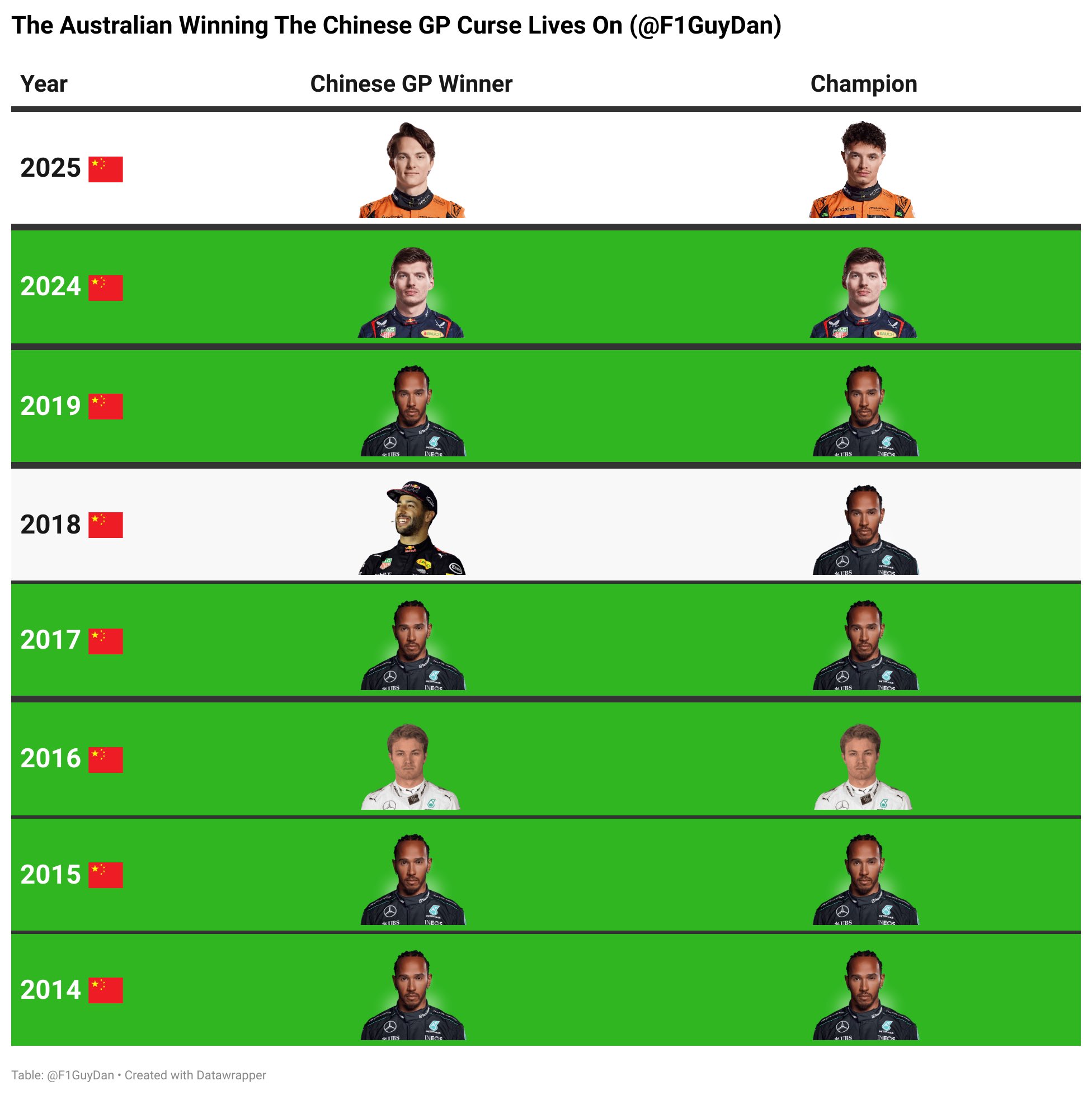 维斯塔潘、刘易斯-汉密尔顿和尼克-罗斯伯格都是这条定律的“受益者”,而澳大利亚车手皮亚斯特里和同胞里卡多一样,尽管在赛季中国大奖赛中获胜,但最终功败垂成。