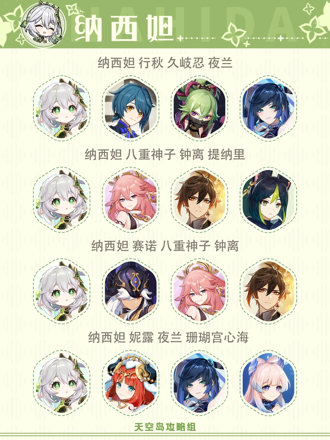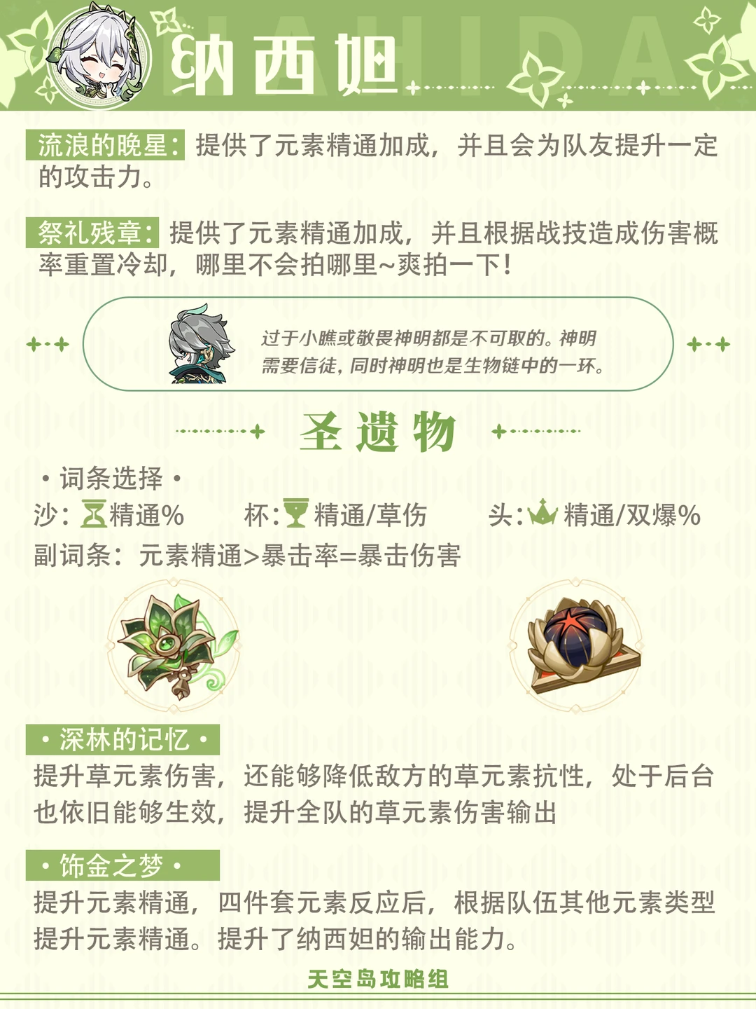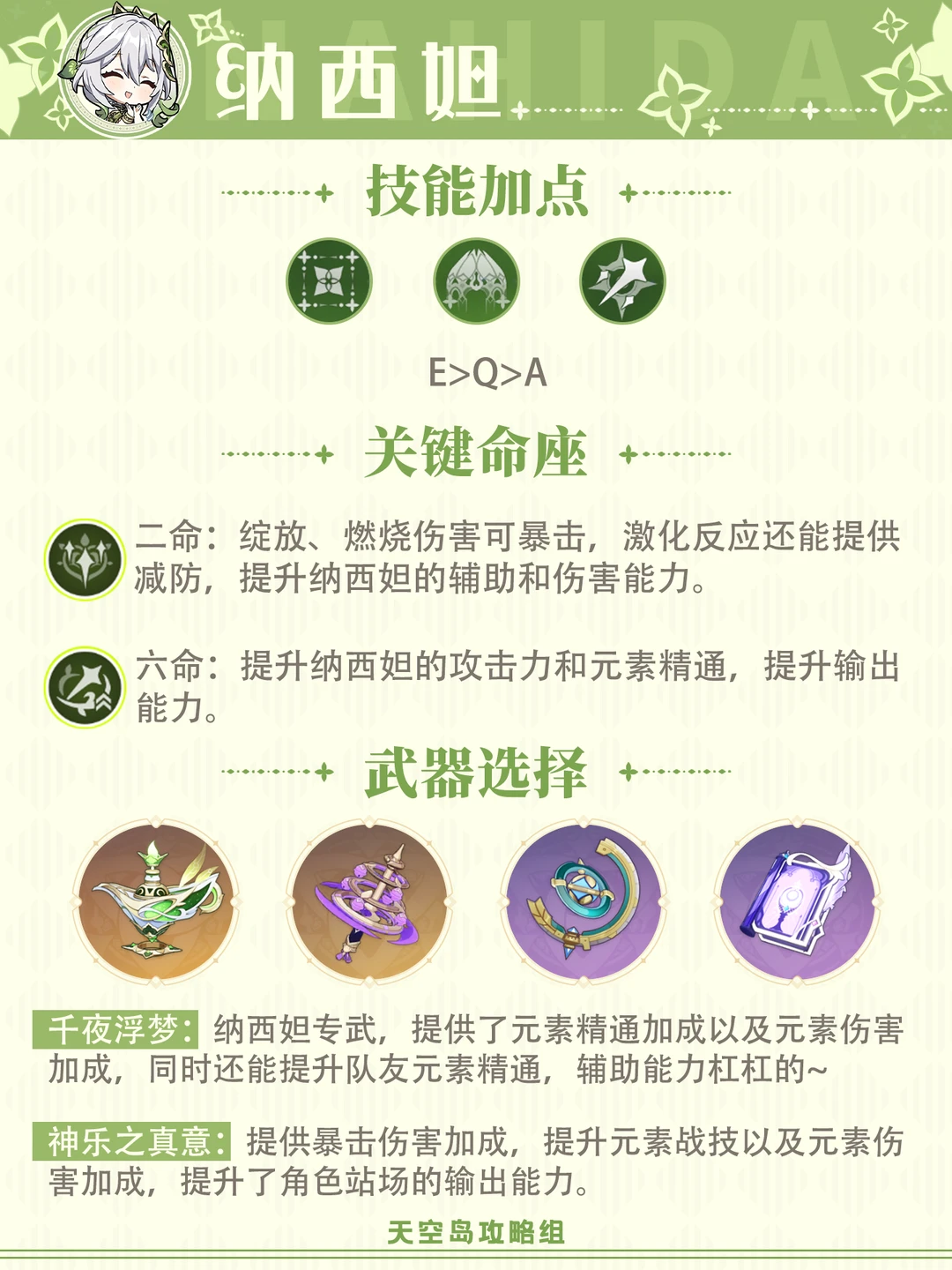 纳西妲是草元素反应核心,看看她如何养成吧[哇R] 1⃣建议天赋:战技>爆发>普攻 2⃣武器选择: 千夜浮梦(专武)、神乐之真意、流浪的晚星、祭礼残章 3⃣️圣遗物:深林的记忆、饰金之梦 精通%沙、精通/草伤杯、精通/双爆%头 副词条:元素精通>暴击率=暴击伤害 4⃣️配队 纳西妲+行秋+久岐忍+夜兰 纳西妲+八重神子+钟离+提纳里 纳西妲+赛诺+八重神子+钟离 纳西妲+妮露+夜兰+珊瑚宫心海