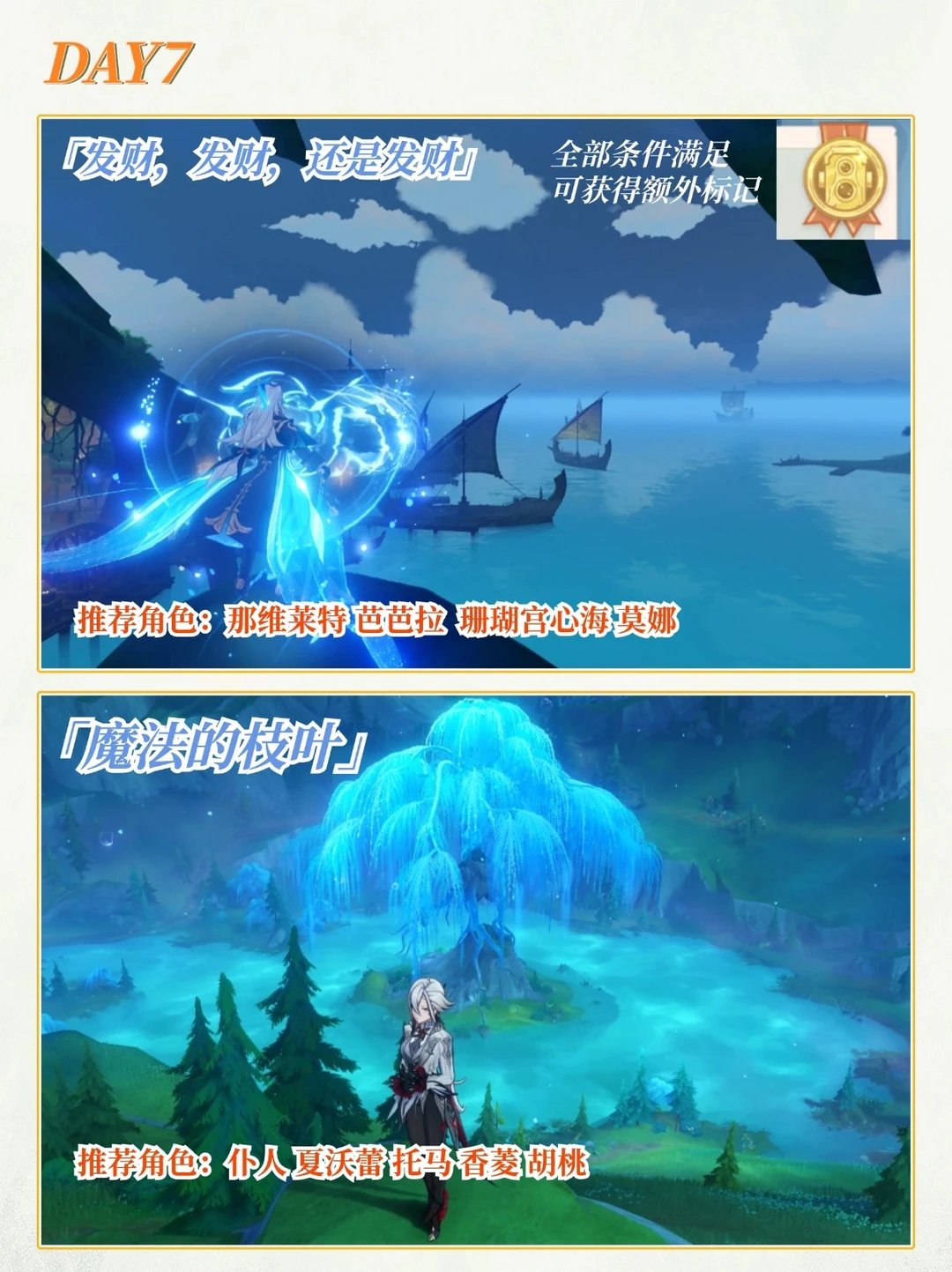画外旅照·浮露之章开启第7天!共2关~ ✨必须装备活动相机即「朝雾的枫丹专用留影机」 DAY7 第1⃣️3⃣️关:「发财,发财,还是发财」 记录「奥摩斯港」 角色进行重击 「水」元素或「法器」角色(2选1) 🍀推荐角色:那维莱特、芭芭拉、珊瑚宫心海、莫娜 第1⃣️4⃣️关「魔法的枝叶」 记录「湖中垂柳」 18至20点 「火」元素或「长柄」角色(2选1) 🍀推荐角色:阿蕾奇诺、夏沃蕾、托马、香菱、胡桃 前7天内容可在动态中找到[喝奶茶R]