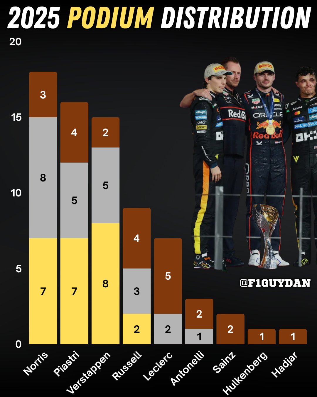 25赛季F1大奖赛领奖台分布:诺里斯总数第一,维斯塔潘八胜