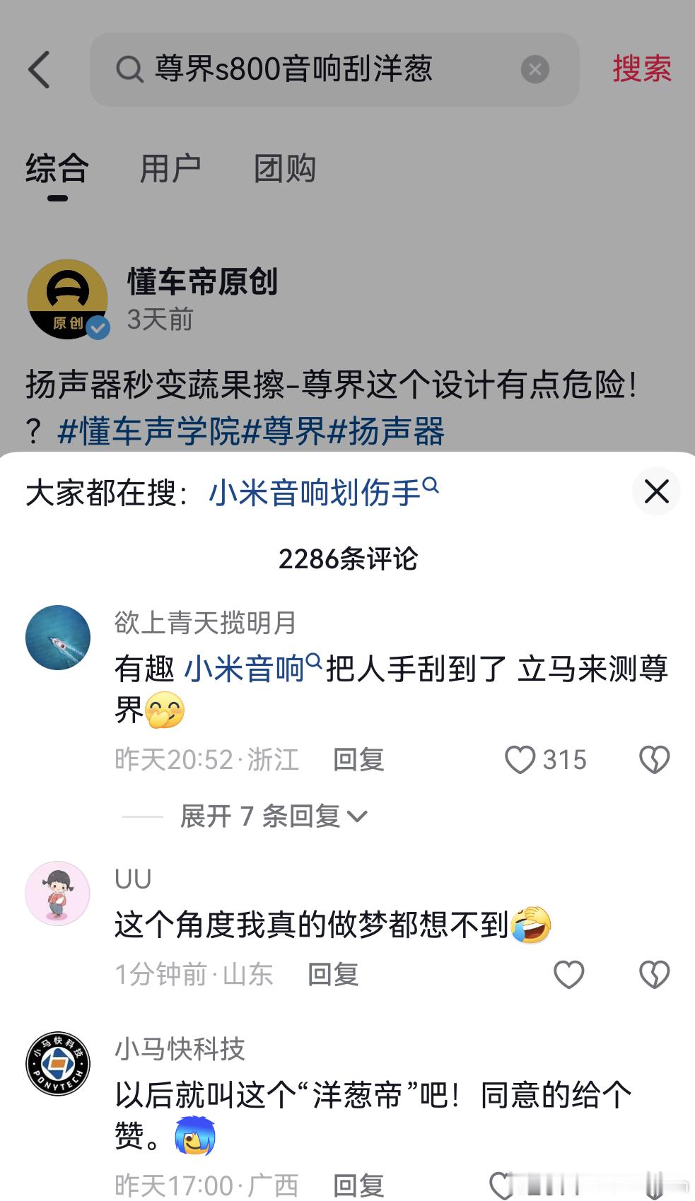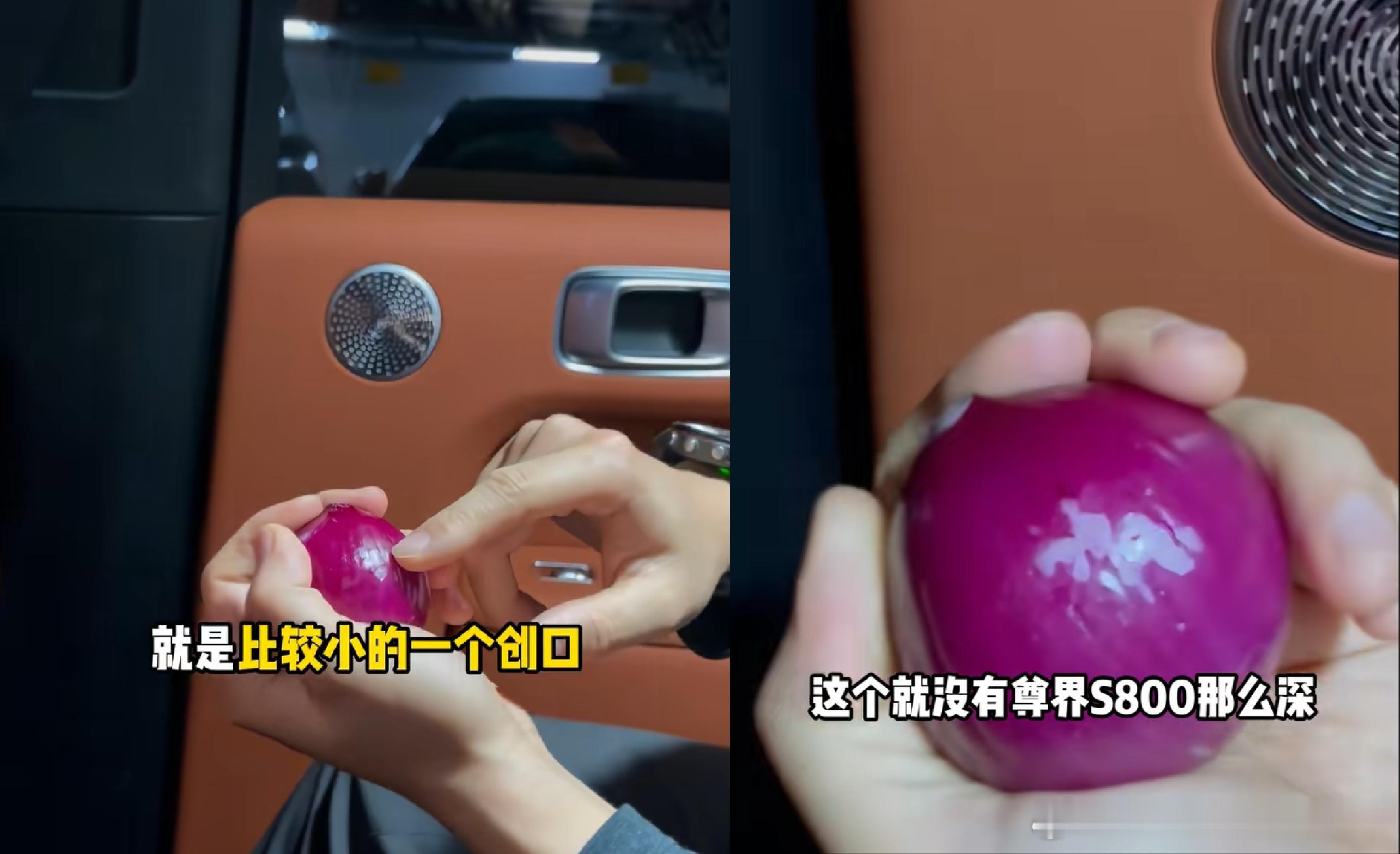 DCD真让人长见识啊,用洋葱去划音响罩测试工艺……测试员说自己左手手腕(戴手表那个区域),被尊界S800后排音响罩划伤了,然后用洋葱对比了理想L9和尊界S800的划口深度……真绷不住了……哈哈哈哈哈哈。纯硬黑,把观众当什么了,还好评论区全是正常人