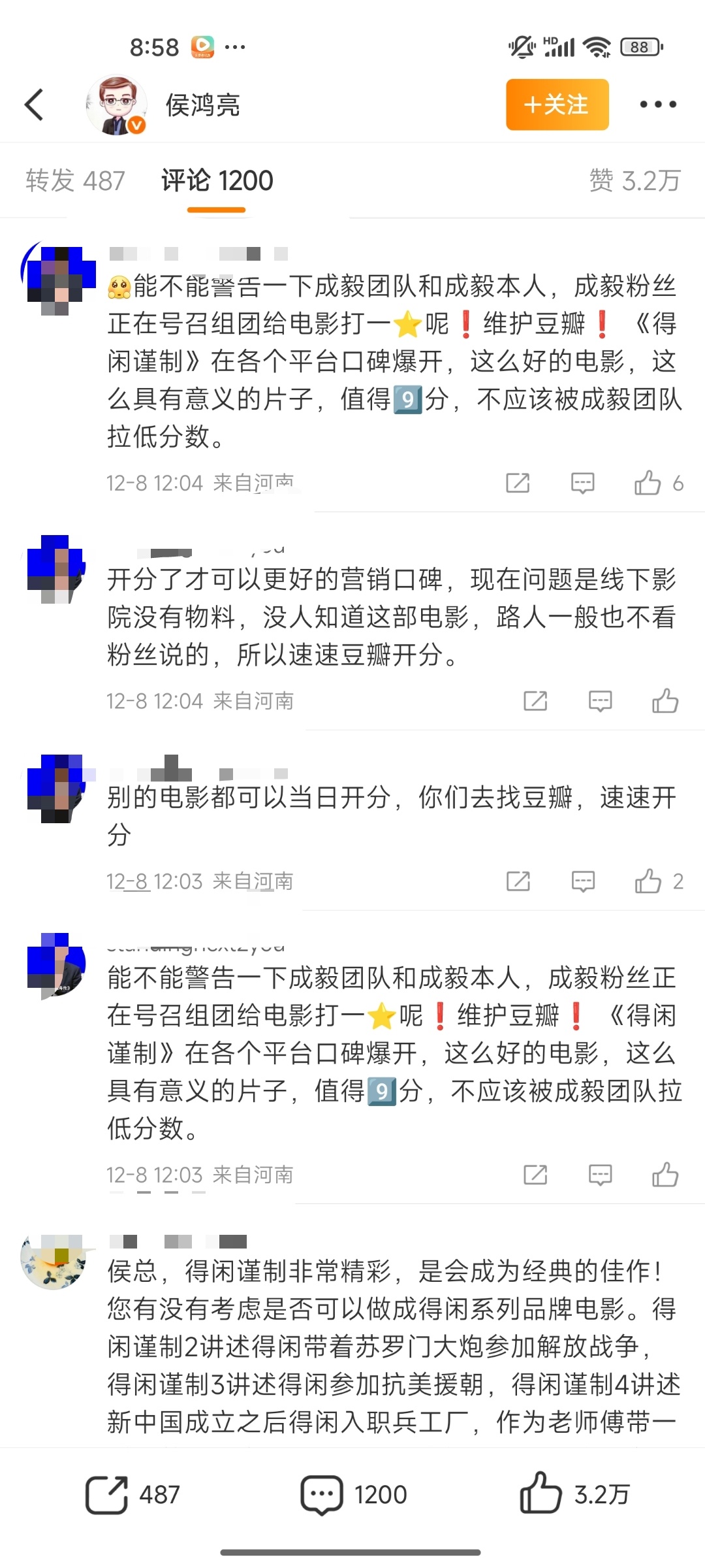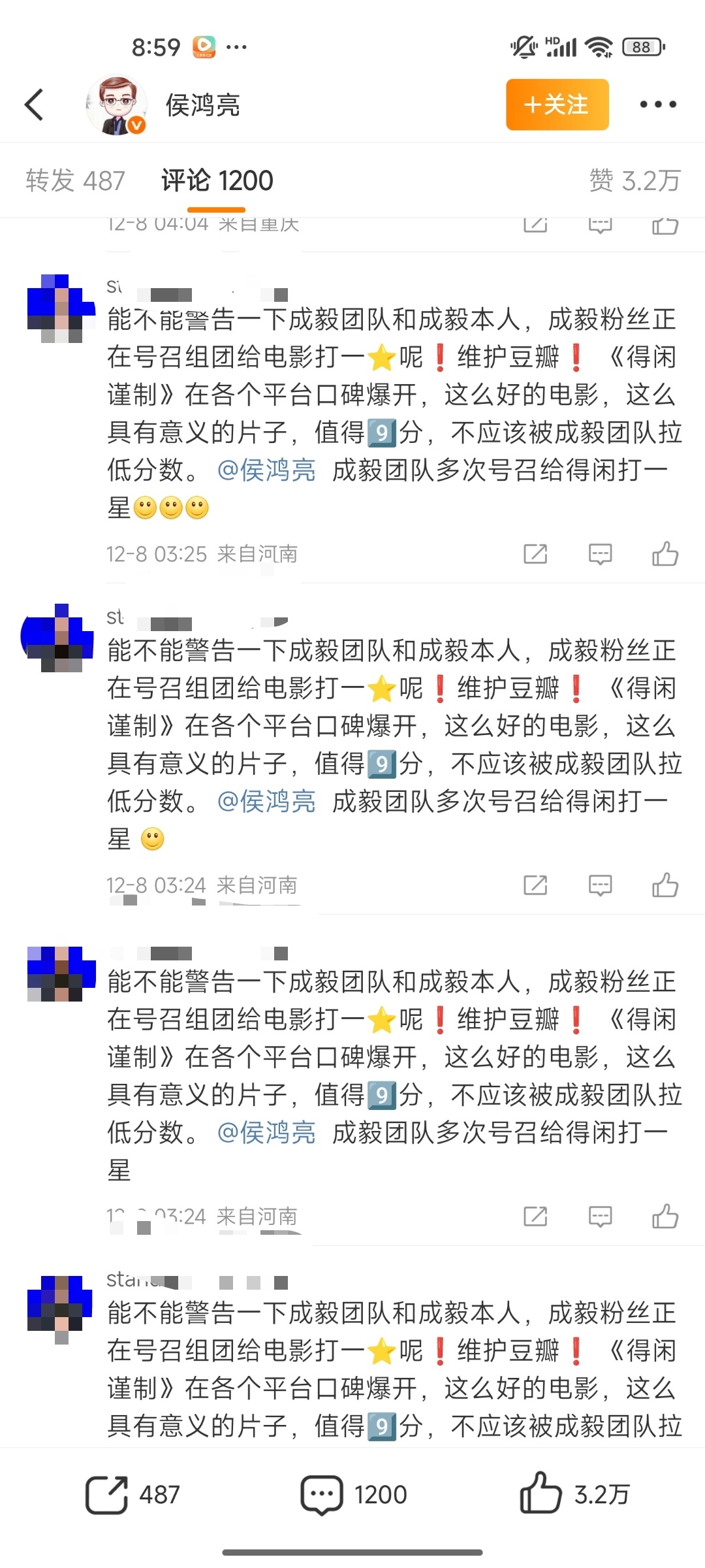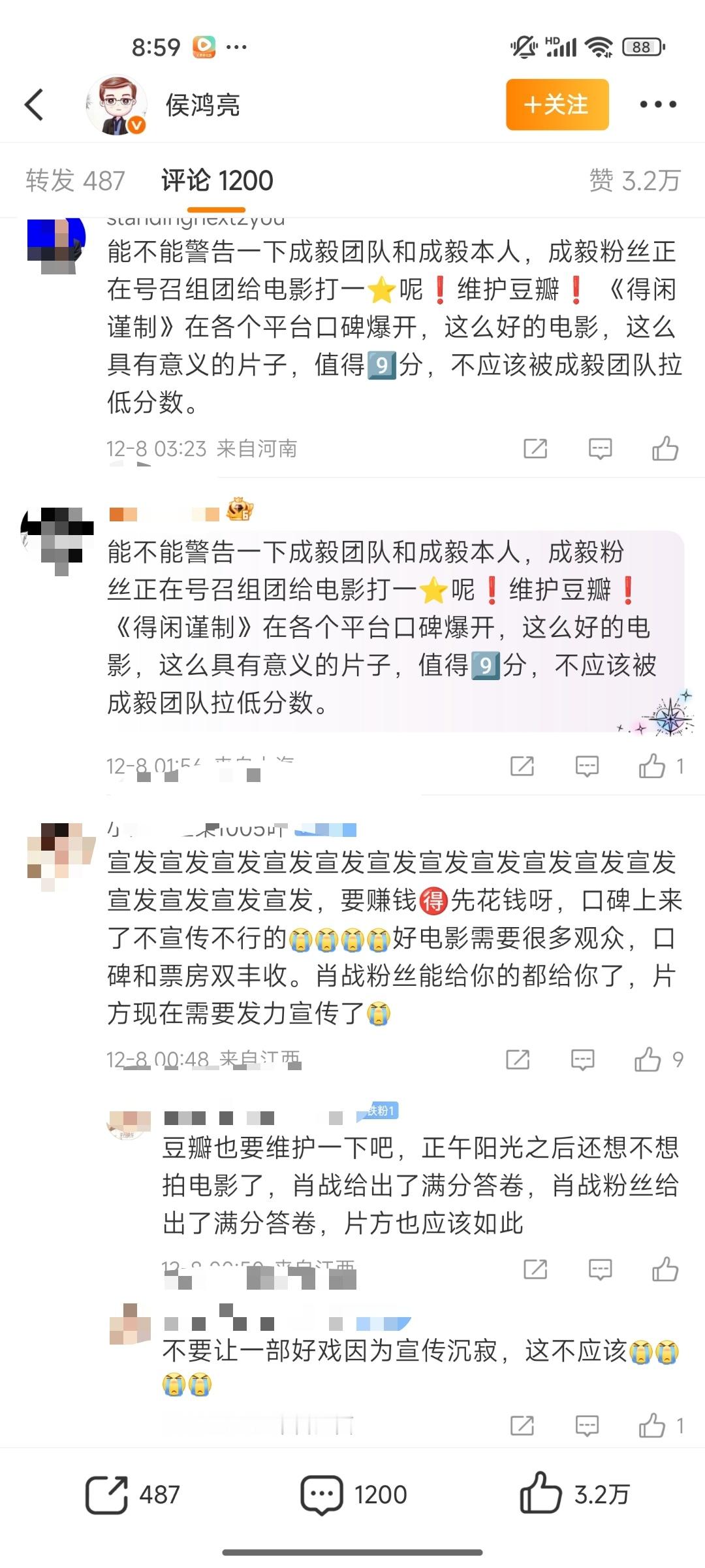 成毅危?《得闲谨制》豆瓣评分6.9,侯鸿亮微博评论区被🦐冲了,要求他找豆瓣,还有警告⚠️成毅。找豆瓣好说,成毅在拍戏,他没惹任何人,别警告他行不行?会影响他拍戏心情的 其实一星二星打的人挺少,这个评分比例还是正常的