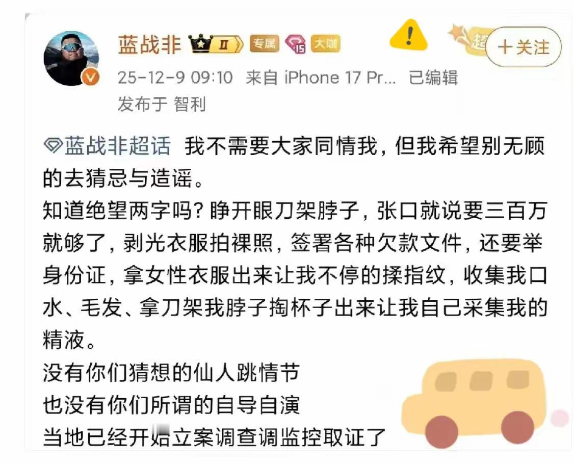 蓝战非被绑后,我和我老婆说,要她连夜把朋友圈清空,什么旅游、晒娃、晒车的都不要放!购物软件地址全部修改非实名,有必要吗?因为你不知道人心叵测 因为财不外露,这句老话在蓝战非身上再一次应验,他晒收入,晒豪车,晒旅游,早已经被人盯上提前布局了! 伤害他的不是外国人而是我们国人,所以该低调的时候千万要低调,否则明天和意外不知道哪一个先来!蓝战非