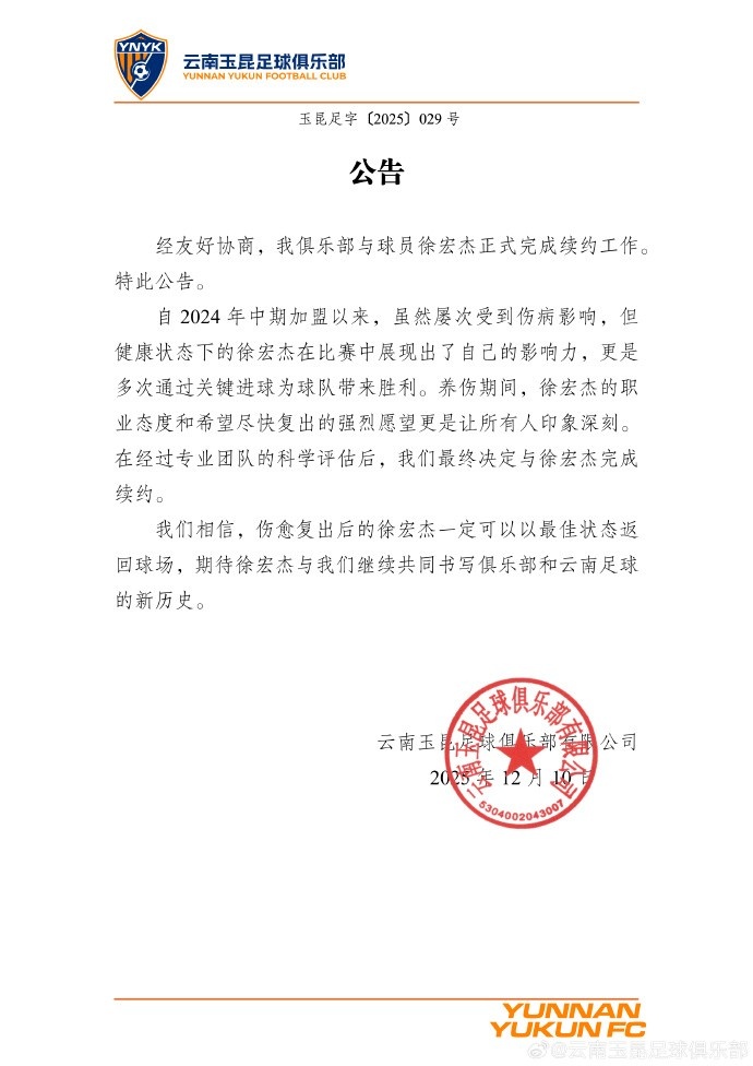 直播吧12月10日讯官方消息,云南玉昆与赵宇豪、徐宏杰完成续约。