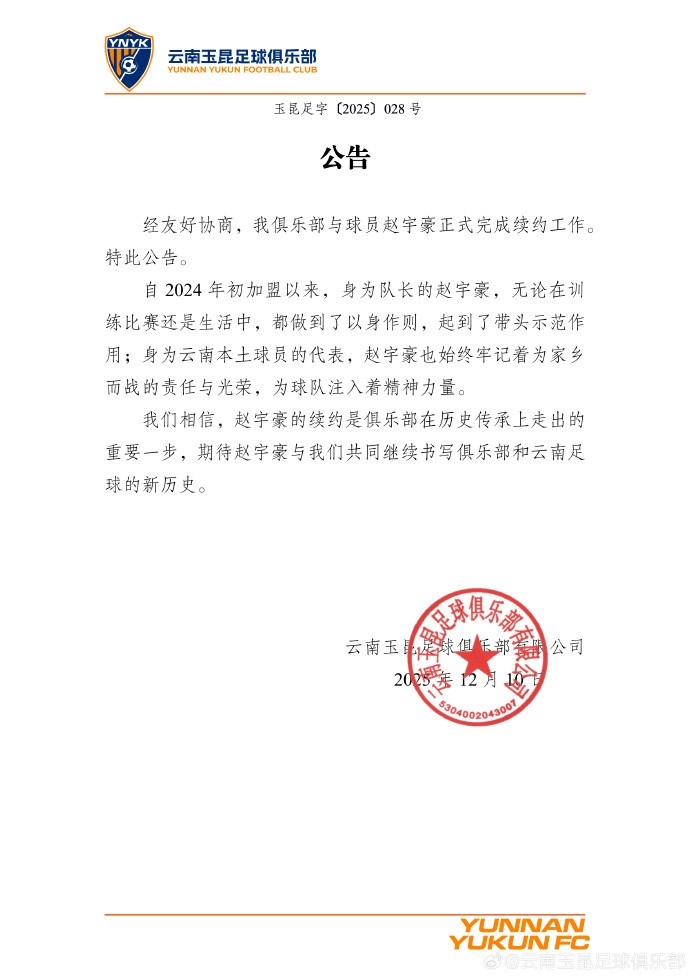 赵宇豪2024年年初加盟云南玉昆,他以队长身份以身作则,同时他也是云南本土球员的代表,玉昆宣布与赵宇豪正式完成续约工作。