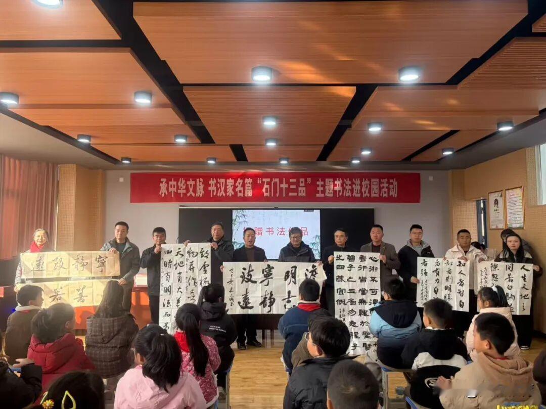 12月5日,宁强县北关小学、宁强县北城实验学校洋溢着浓郁的墨香与文化气息,“承中华文脉 书汉家名篇——‘石门十三品’主题书法进校园”活动如期举行。县教研室负责人及书法名家杜正满、张远智、刘隆军等十余位嘉宾,分赴两所学校,与两校师生齐聚一堂,以笔墨为桥,共赴中华优秀传统文化传承之约。 以书为礼,两校共启文化之约 活动启动仪式在北关小学报告厅举行。北关小学负责人表示,“石门十三品”是汉中文脉的瑰宝,本次活动是学校传承中华优秀传统文化的重要实践。县教研室负责人、书法名家杜正满先后在两所学校发言,寄语两校师生以书法为媒,传承汉隶风骨。书法名家分别向两所学校捐赠了精心创作的作品。 品书论艺,两校共探传承之道 张远智老师分别走进北关小学、北城实验学校,结合“石门十三品”的历史背景与拓片实例,生动解读其书法风格、笔法精髓,深入浅出的讲解让在场学生听得入神,直观感受到古代书法艺术的博大精深。 在北关小学党员活动室、北城实验学校会议室里,座谈交流会温情开讲。杜正满、刘隆军、牟君诚等书法名家真挚表达对本次活动的赞赏,分享将书法融入小学生书法学习启蒙的思考,两所学校负责人和参会老师们也分别表达了对书法艺术的热爱,现场交流氛围热烈。 手把手教,两校共传笔墨之技 北关小学、北城实验学校的书法室成为活动的“核心阵地”,书法名家们一对一、手把手指导学生握笔姿势与运笔技巧,重点指导书写“石门”二字。耐心的讲解、细致的示范,让孩子们快速掌握书写要领。墨香袅袅中,两校学生一张张稚嫩却认真的书法作品逐渐成型,脸上满是收获的喜悦。 活动让两所学校的师生深入了解“石门十三品”的历史文化内涵,提升了书法技能与审美素养,在校园内共同筑牢了传统文化传承的根基。两校表示,未来将持续以书法艺术为纽带,让墨韵浸润校园,让中华文脉在两校童心间代代相传。