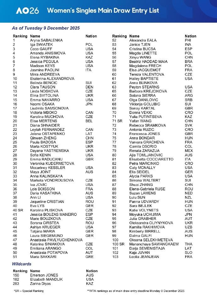 虎扑12月10日讯2026澳网公布单打正赛入围名单,郑钦文、王欣瑜和张帅直接入围正赛,王雅繁使用保护排名出战。