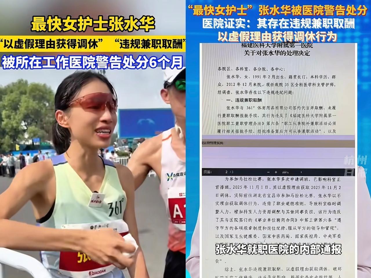 处罚还是来了,张水华以为能躲过去,但她违规在先,躲得了初一,躲不过十五的。 她因违规兼职获取片酬,以虚假理由获得调休,被单位处分6个月,年度考核不能参与评优了。 这个处罚一点都不冤,反而还轻了,她能在50天内跑了4场马拉松比赛,足以见得她在调休方面有多离谱,而这几场比赛也给她带来不少好处,其中就有超20万的奖金。 说起来,单位对她还是很好的,继8月份的舆论,单位没有给她落井下石,而是给她机会,但从她分享的视频来看,她不仅没有吸取教训,还一如既往的高调。 要是抛开工作的成分不说,她确实是一名优秀的马拉松选手,但可惜了,“鱼和熊掌”向来都是不能兼得的,她不能既要又要还要。