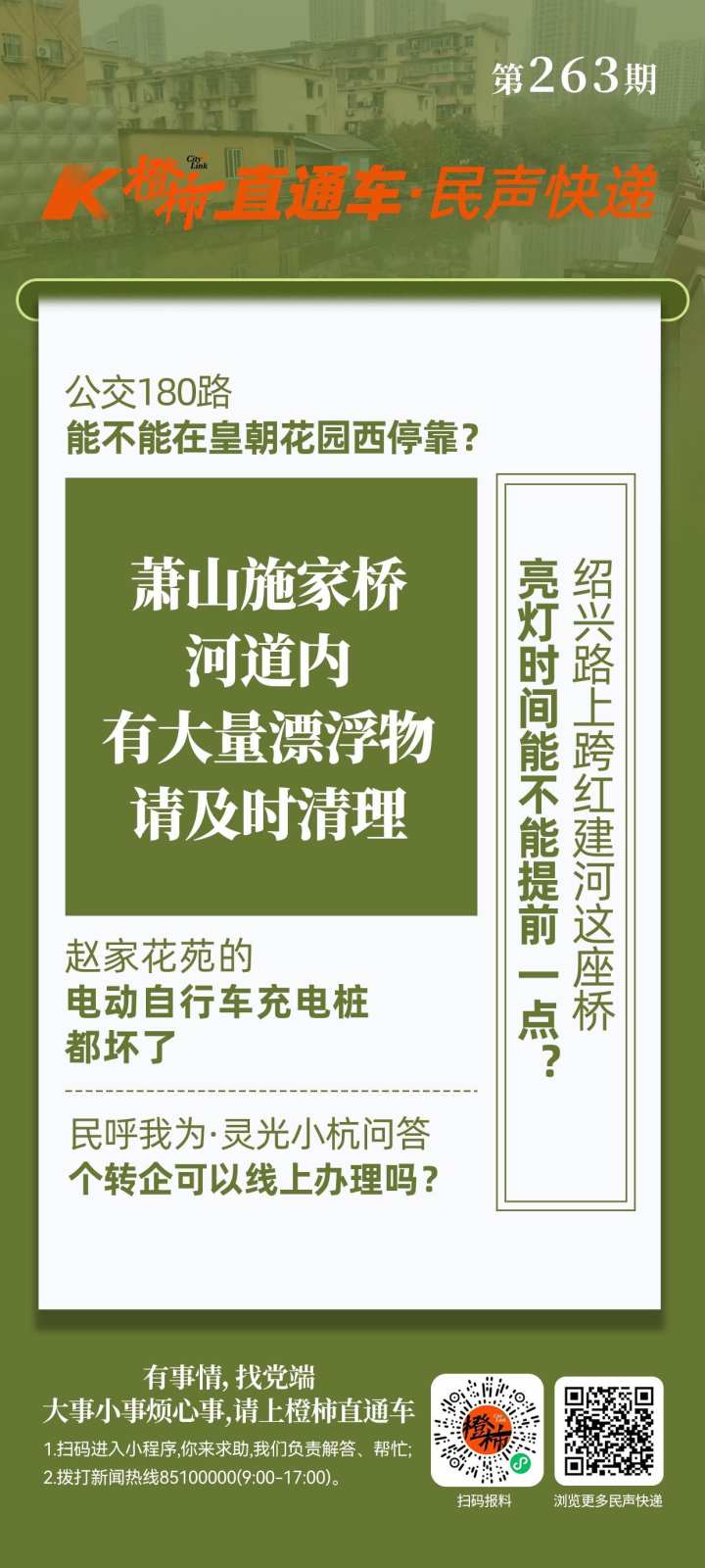 市民陈先生向橙柿直通车反映:萧山北干街道工人路与二棉路交叉口的施家桥河道内,有大量漂浮物,请及时清理。
