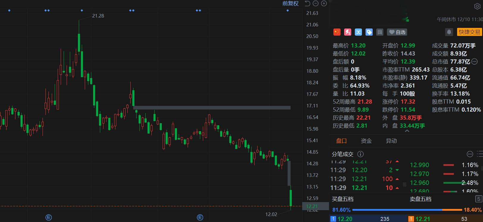 天源迪科(300047.SZ)大幅下跌超15%,跌幅居市场首位,盘中低见12.02元刷新阶段新低,总市值77.87亿元。