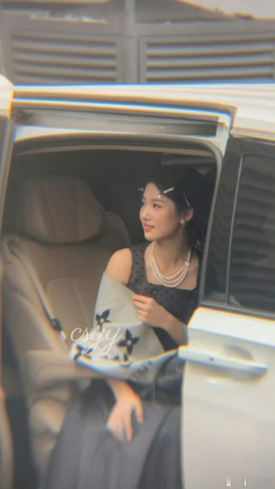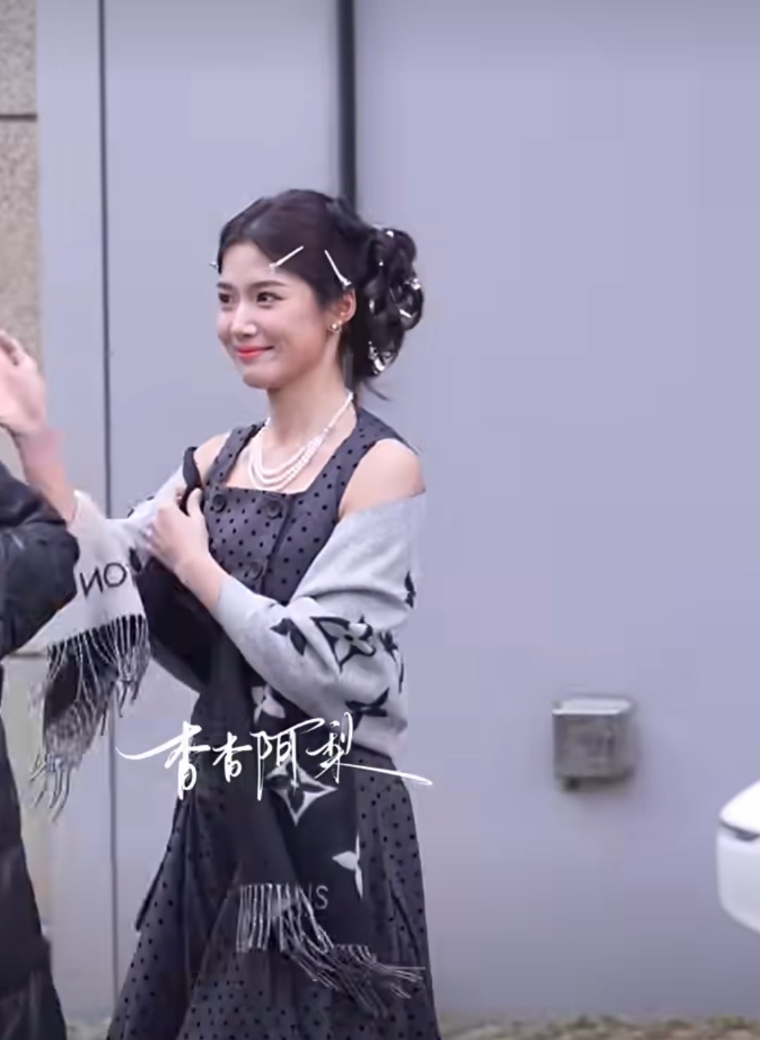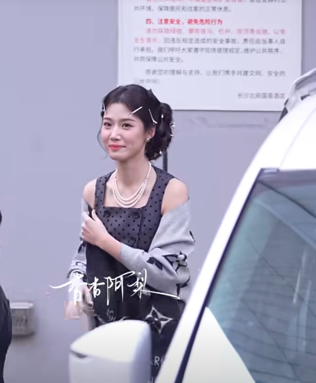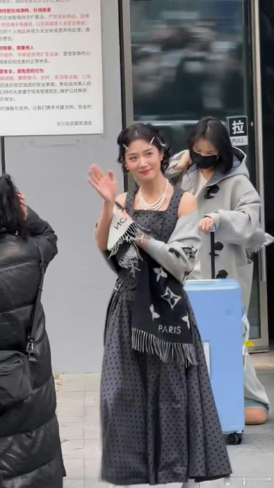 卢昱晓hi6上班路透黑色波点裙卷发沪上民国千金风好美😍一路跟粉丝打招呼亲和力满分