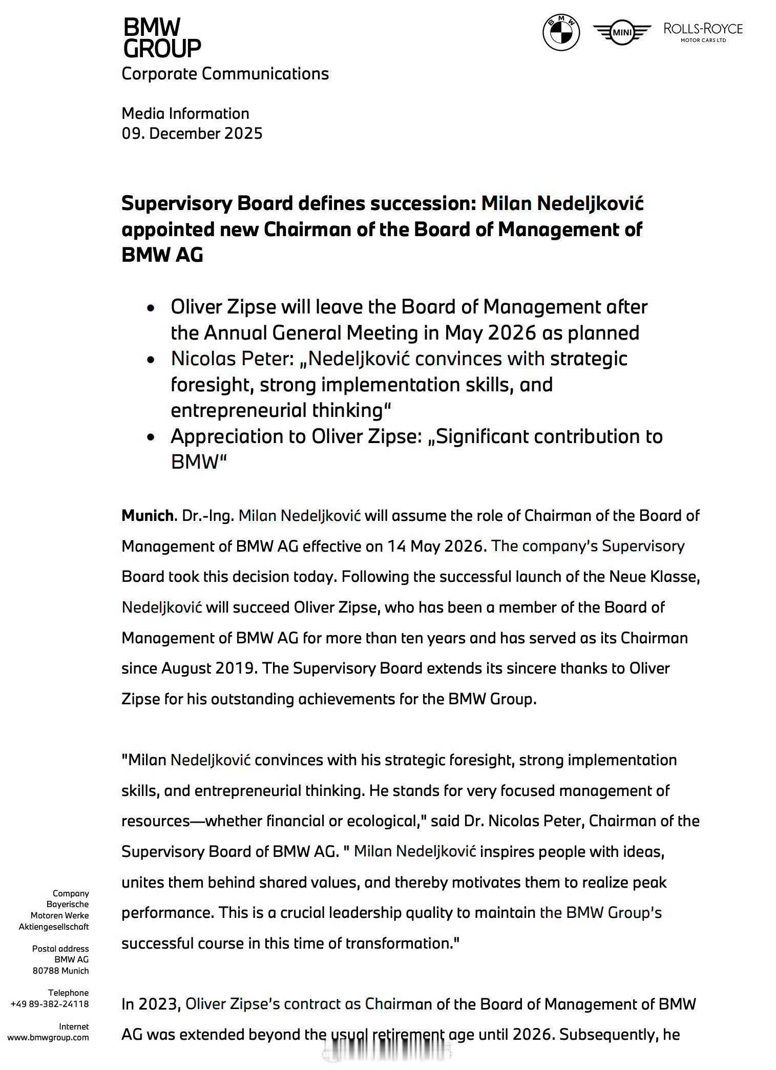 宝马官宣换帅!宝马现任CEO齐普策将于2026年4月退休!诺德科沃奇将接任!