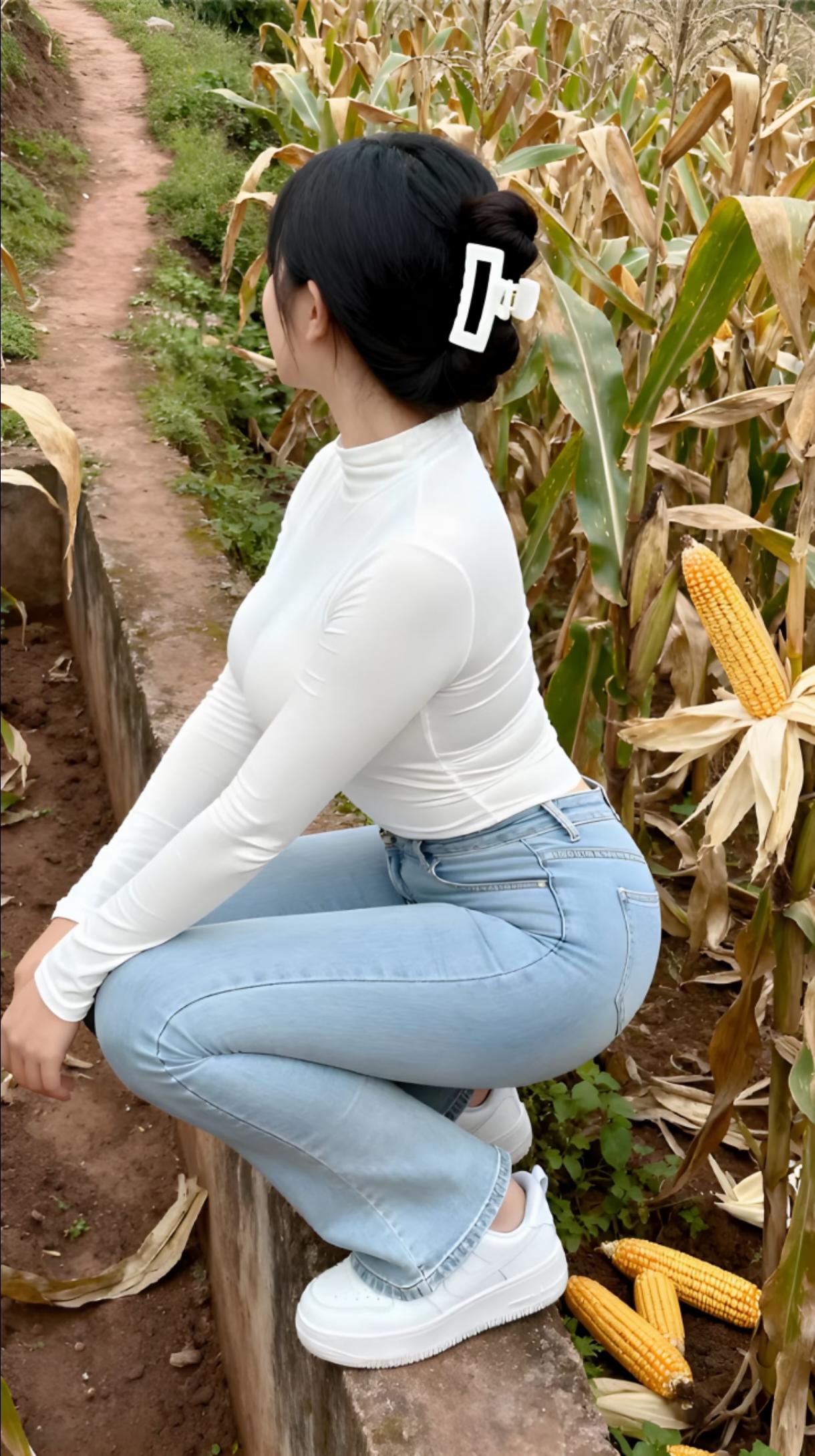 玉米地的风 秋把黄,揉进玉米叶的褶皱里 她蹲在田埂边时 风掠过发间的白抓夹 像扯了扯人间的温柔 指尖碰着饱满的玉米棒 秸秆的糙,裹着泥土的香 顺着掌心,漫进午后的光 白衫贴着脊背 把山野的清,收进一寸寸肌理 起身时,牛仔裤的蓝 晃过石阶,晃过散落的玉米穗 背影走向绿意漫卷的山 步子轻,像怕踩碎 土地酿了一整个夏天的甜 石台上的水壶,竹编的筐 都盛着山野的日常 她望向远山的模样 像把琐碎的美好 都揉进了玉米地的风里 风掠过,秸秆轻响 是土地低声的回应 不张扬,不喧嚣 只是把平凡的瞬间 酿成了时光里,最踏实的甜 山是沉默的,玉米是饱满的 她站在其间 像秋的一部分,像生活的一部分 把人间的暖,落进每一寸泥土 落进每一缕掠过发梢的风里漫步风的季节 田埂上的秋天 下过雨的玉米地 田园风玉米地 秋韵之风 田园玉米风光 乡间田野风