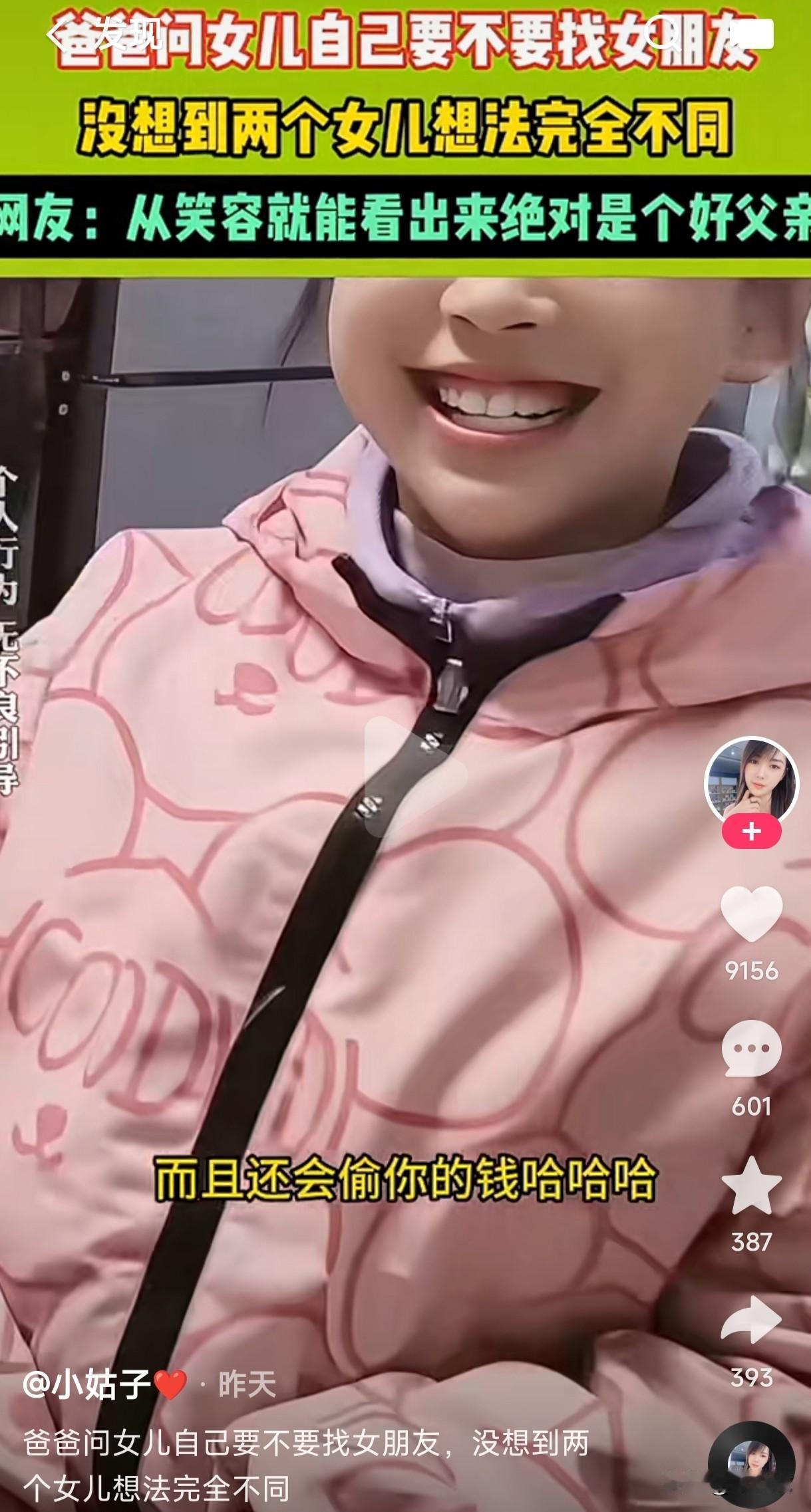 爸爸问两个女儿自己要不要找女朋友 没想到两个女儿的想法完全不同 穿红衣服的女儿是懂男人的孤独 她说找个女朋友爸爸就不孤独了 有人洗衣做饭陪伴在身边多好 穿粉色衣服的女儿最懂女人的贪婪 找个女朋友就把钱骗走了 最后还会溜之大吉 一个人自由自在多好 爸爸听了两个女儿的话后哈哈一笑 到底应该听那个女儿的 一个是懂男人的 另一个是懂女人的 这到底是找 还是不找呢