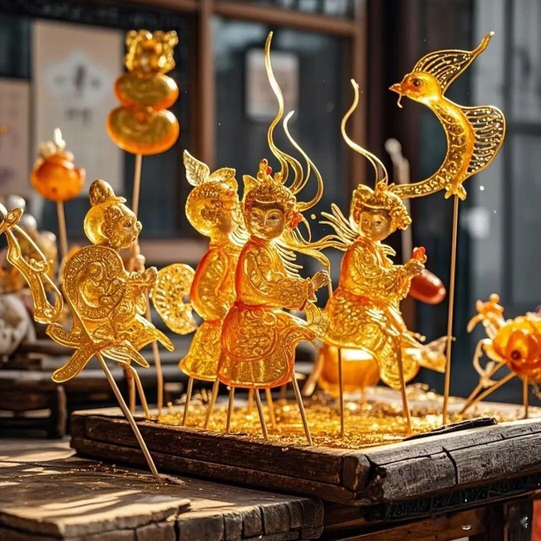画糖人以糖为“墨”、以勺为“笔”,艺人通过精湛技艺,将糖液在石板上勾勒成十二生肖、神话人物、花鸟鱼虫等生动造型,线条流畅自然,形象栩栩如生,兼具观赏性与趣味性。
