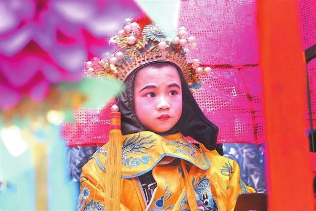 孩子坐在花轿里,扮演历史或神话故事人物。