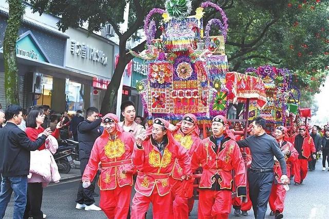 早年,每台“妆古史”由4名壮汉肩抬,另有4人辅助换班,巡游耗时耗力。为适应现代需求,花轿改良为滑轮装置,既省时省力,又降低了参与门槛,吸引更多人加入巡游队伍。队伍中还有高跷、旱船、媒婆、蚌壳精和乌龟等生动有趣的形象,他们的精彩表演为活动增添了许多欢乐和趣味。