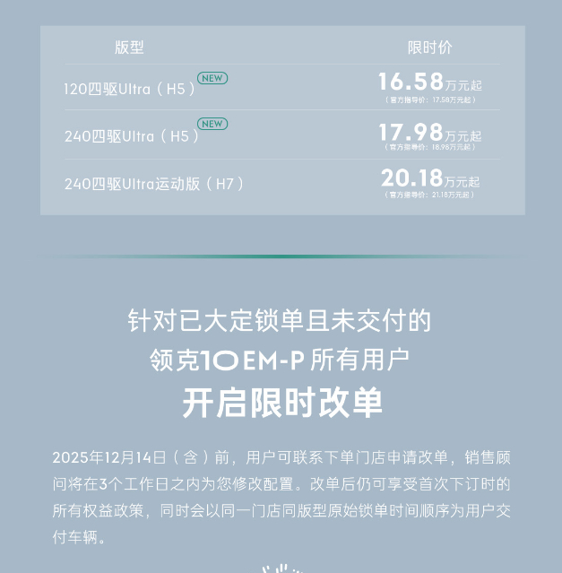 车若初见 上市3个月,领克10EM-P累计销量突破2万台,也连续3个月中大型混动轿车销量前三。响应大家的声音,今天还上线了千里浩瀚H5版型,比H7版型便宜6000元,大定锁单且未交付的用户可以限时改单,对于不喜欢用智能辅助驾驶的家庭,是一次比较灵活的选择。