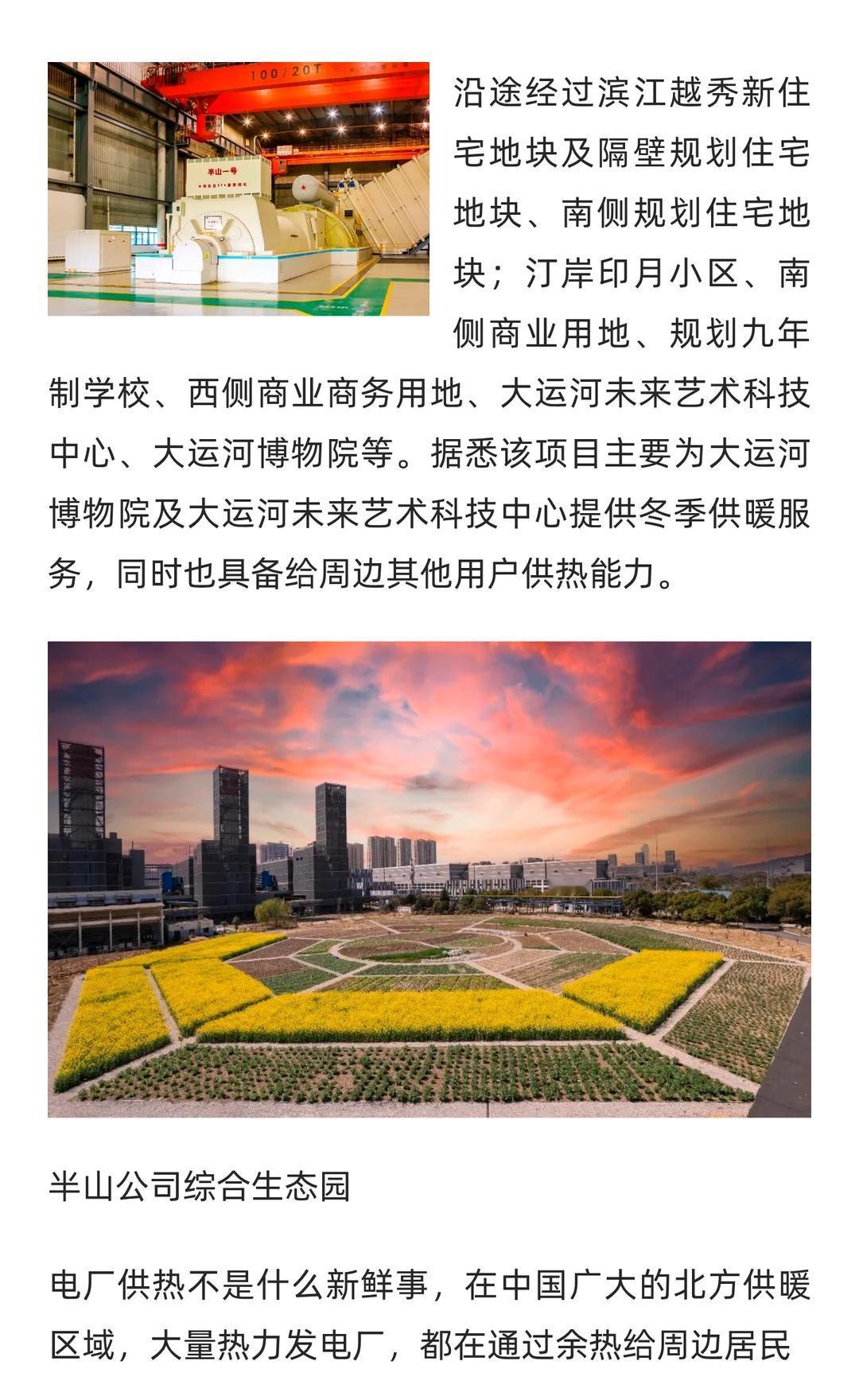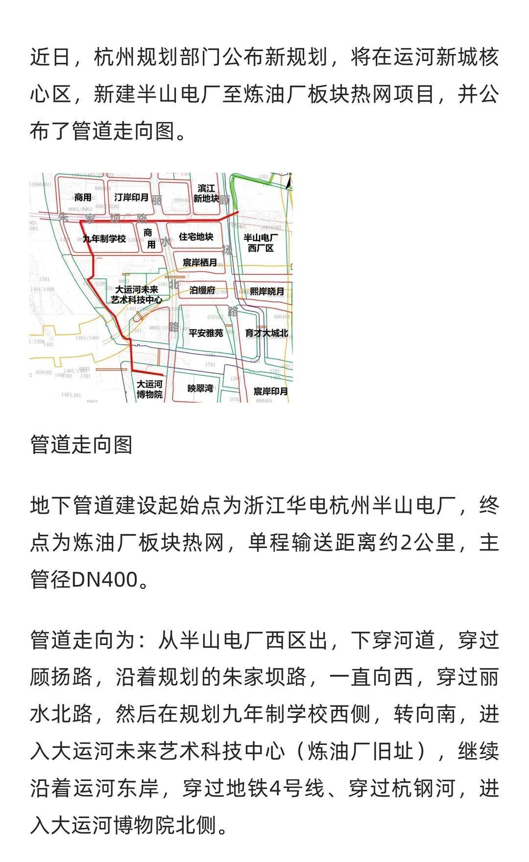 羡慕!杭州城北这个板块要集中供暖了 管道走向为:从半山电厂西区出,下穿河道,穿过顾扬路,沿着规划的朱家坝路,一直向西,穿过丽水北路,然后在规划九年制学校西侧,转向南,进入大运河未来艺术科技中心(炼油厂旧址),继续沿着运河东岸,穿过地铁4号线、穿过杭钢河,进入大运河博物院北侧。 沿途经过滨江越秀新住宅地块及隔壁规划住宅地块、南侧规划住宅地块;汀岸印月小区、南侧商业用地、规划九年制学校、西侧商业商务用地、大运河未来艺术科技中心、大运河博物院等。据悉该项目主要为大运河博物院及大运河未来艺术科技中心提供冬季供暖服务,同时也具备给周边其他用户供热能力。