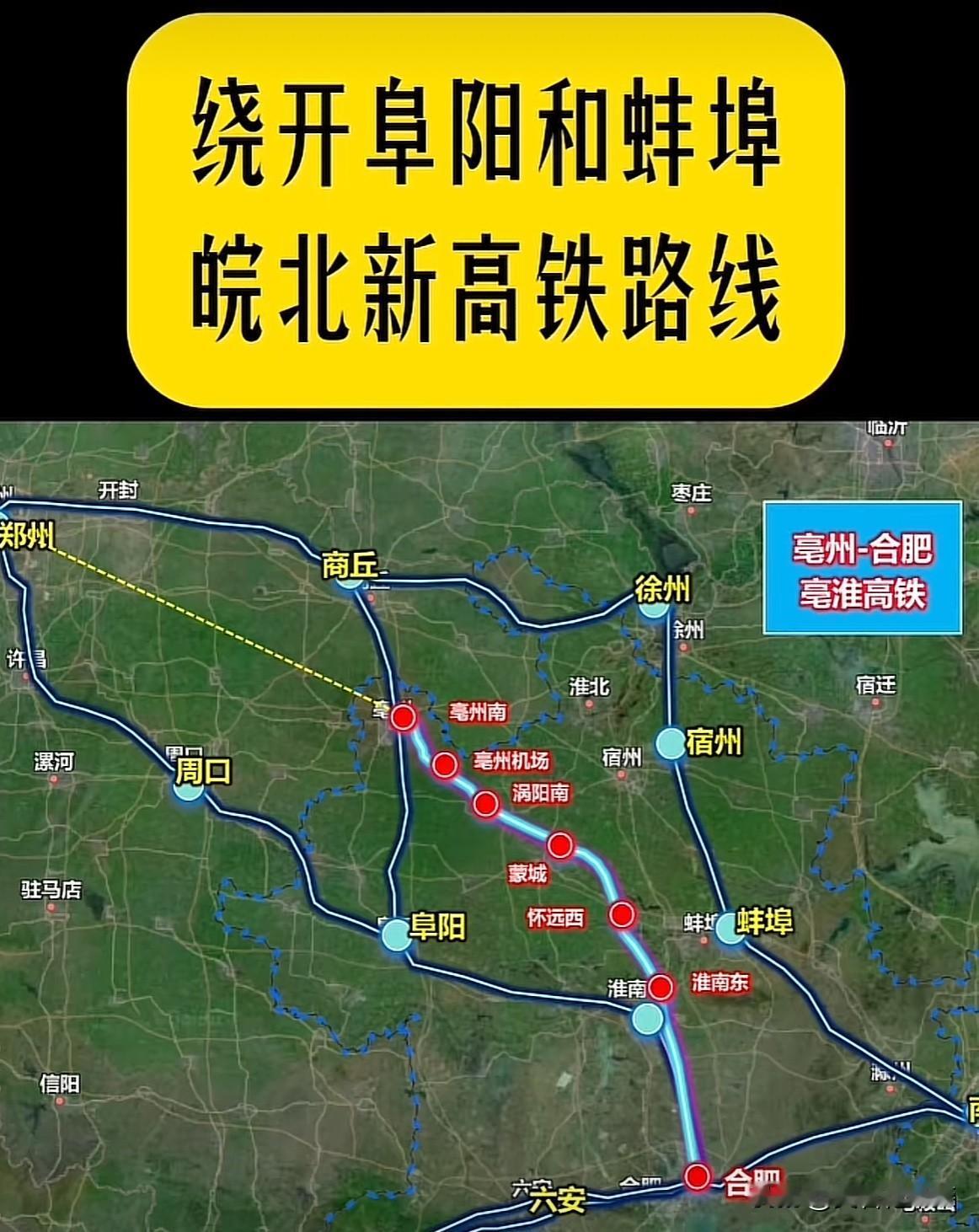这个简直是天才规划啊! 亳州南~亳州机场,涡阳南,蒙城南,怀远西,淮南东,合肥西站高铁线路! 这个路线直接让整个皖北腹地打开大门,直接面对安徽南部地区。 也是通往长三角地区的神来之笔啊! 省里面能多点重视就好了。安徽高铁
