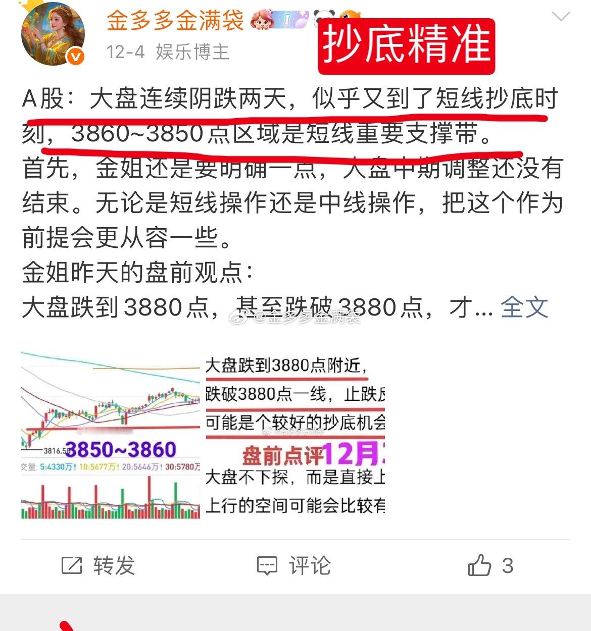A股:上周四抄底,本周一逢高跑路(有图有真相)——“神'”一般的短线操作!市场连续普跌,到了短线抄底时刻吗?周一沪深两市大涨,一批人开始唱多市场。说大盘收复4000点的有之,说市场反转的有之。市场连续普跌两天,盲目看多市场的投资者被打了个措手不及。上周五出利好,金姐就感觉这个利好来得时机不一般。恰好是赶在“会”之前,这摆明了是为了“稳”市场。结合不太给力的技术面。金姐认为市场反弹高度有限,不认可市场会反转的观点。所以,金姐在上周末以及本周一都警示了市场风险。大盘连续下跌,会不会出现抄底机会呢?目前上证综指MA5均线位于3898点,MA10均线位于3894点。早盘上证综指以3901点开盘,直接就跌到了MA5均线附近,说明MA5均线在短期内失去了支撑作用。从分时趋势来看,早盘快速下跌之后,指数在低位整理,没有继续下行探底,似乎有了短线到底的迹象。不过,从分时均线来看,还需要进一步修复,还看不到大幅反弹的迹象。或者说,即使反弹,力度也会比较有限。如果不出现分时成交量放大的现象,不建议着急进场抄底,因为很可能买在小山腰。文中个股,并非推荐,仅为说明市场现象。个人观点,仅供交流,不构成投资建议!理财有风险,投资需谨慎!郑重声明:金姐没有圈子,没有助理,不会主动联系任何人,谨防上当。A股行情A股市场