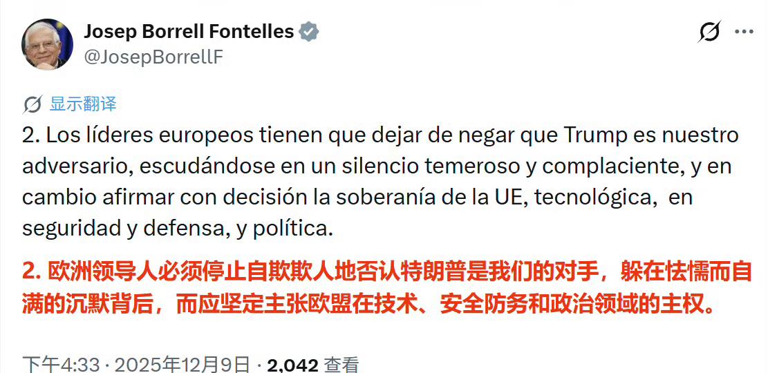 最近欧美之间吵得挺凶。前欧盟委员会副主席博雷利甚至用了“政治宣战”这么重的词,来形容美国对欧盟的态度。他点名批评的,正是美国副总统万斯。 这场风波的直接导火索,是一笔罚款。12月初,欧盟依据自己的《数字服务法》,对美国企业家马斯克旗下的社交平台X开出了1.2亿欧元的罚单。理由是平台在认证机制和广告透明度上存在问题,并且没有向研究人员开放数据。 这笔罚单一出,立刻捅了马蜂窝。万斯在罚款前就发帖指责欧盟“攻击美国企业”,说他们的理由都是“垃圾”。罚款落地后,他更是联合了好几位美国高官一起声讨,声称这是“对美国人民和科技平台的攻击”。马斯克本人反应更激烈,直接呼吁“废除欧盟”,骂它是“官僚怪兽”。 在博雷利看来,这远不是一次简单的商业纠纷。它暴露了双方更深层的矛盾。今年早些时候,万斯在慕尼黑安全会议上的一番演讲就让欧洲人很不舒服。他公开贬低欧盟的价值观,说欧洲最大的威胁来自内部,还批评了欧盟的移民政策。这让在场的德国防长当场反驳,说他的言论“不可接受”。 美国在一些官方报告里,也把欧盟描绘成“监管过度”的负面典型。一边要求欧洲在防务上承担更多责任,另一边又在贸易和科技规则上不断施压,想让欧盟的法规给美国利益让路。欧盟这边则坚持自己的数字法规必须独立执行,强调罚款关乎规则,无关政治审查。 更让欧盟主流政客警觉的是,万斯等美国政客似乎有意和欧洲的极右翼政治力量走近。这被解读为美国在试图从内部影响甚至分化欧洲。 面对这种局面,欧洲的回应复杂而矛盾。欧盟外交负责人一边强调美国仍是“最重要的盟友”,试图给局势降温。但德国法国等国的领导人已经公开对跨大西洋关系表示怀疑。有声音主张,欧洲应该联合其他志同道合的国家,组建新的合作集团,加速推进防务自主和数字领域的“去风险化”,减少对美国的依赖。欧盟内部对此也有分歧,匈牙利领导人就明显更亲近万斯的观点。 博雷利用“政治宣战”这个词,标志着一个深刻的转变。它说明大西洋两岸的盟友关系,正经历着意识形态和经济利益的双重裂痕。短期内,双方在数字规则、乌克兰问题主导权等具体议题上的角力不会停止。长期来看,欧盟寻求“战略自主”、在关键领域与美国渐行渐远的趋势可能会加快。 这不是一场真正的战争,但它关乎未来由谁来制定规则、谁的价值观念更有话语权。这场没有硝烟的博弈,其激烈程度一点也不亚于真正的冲突。美副总统万斯 冬日生活打卡季