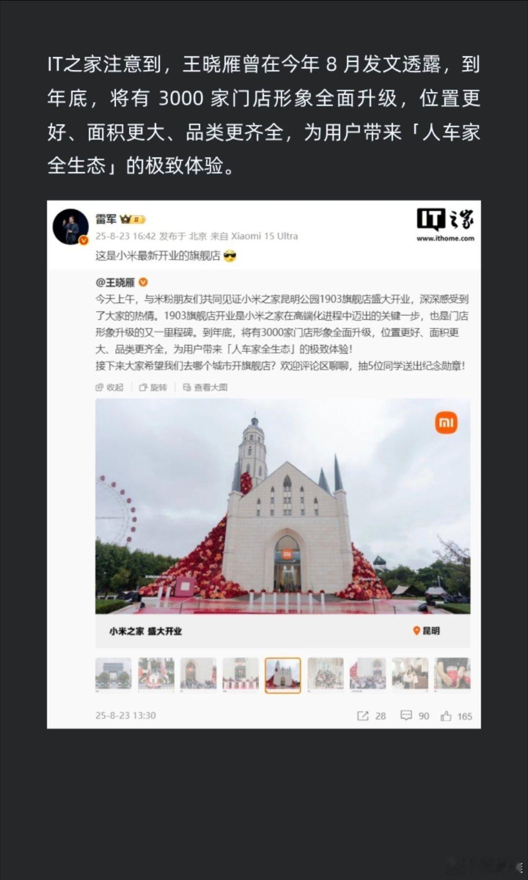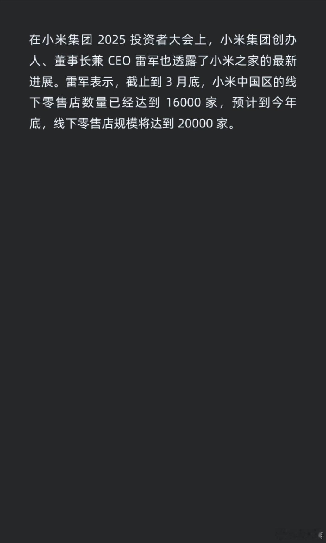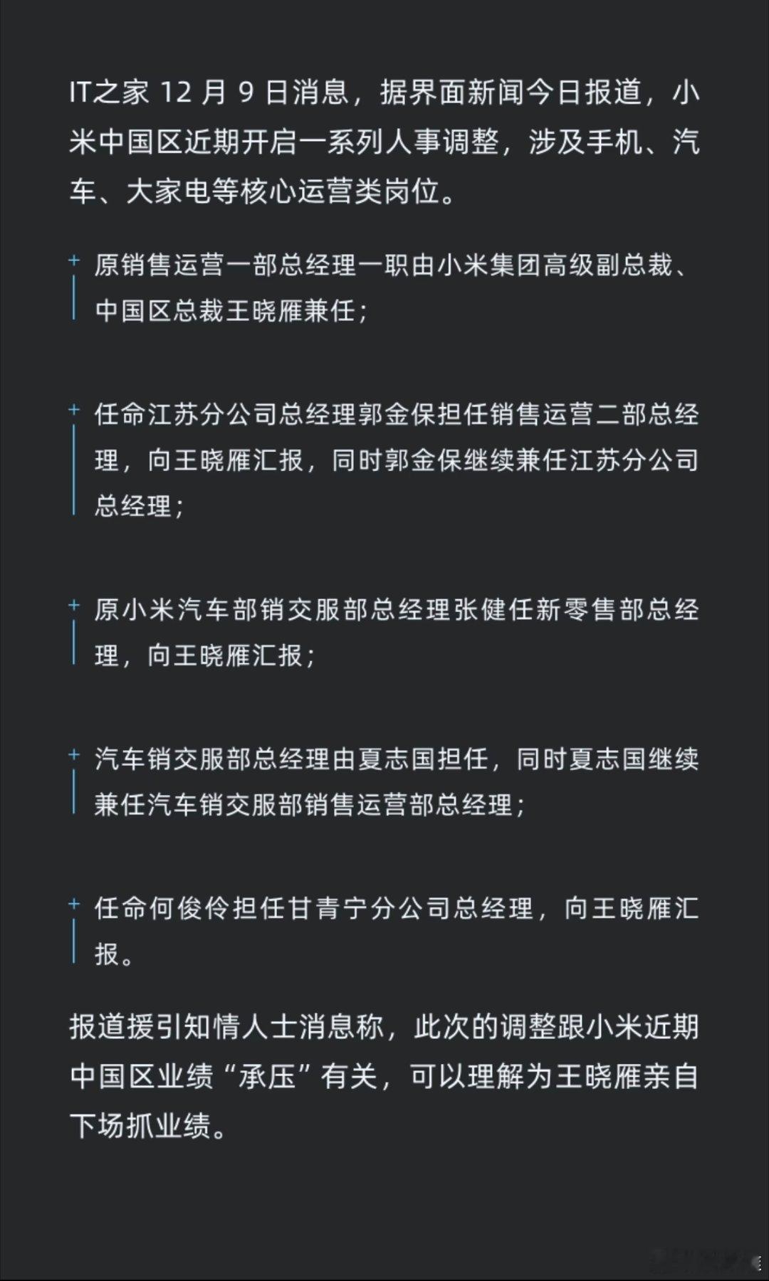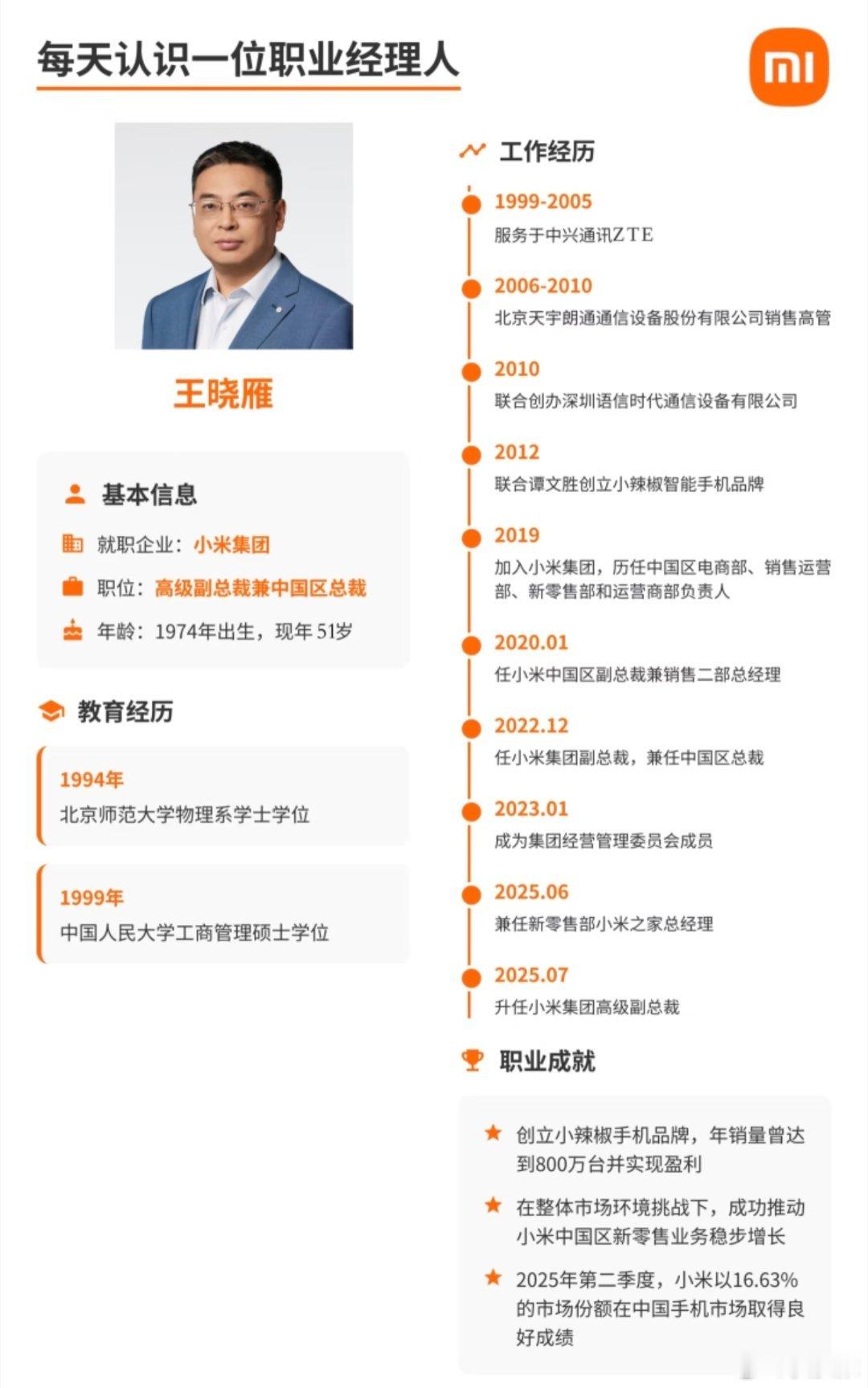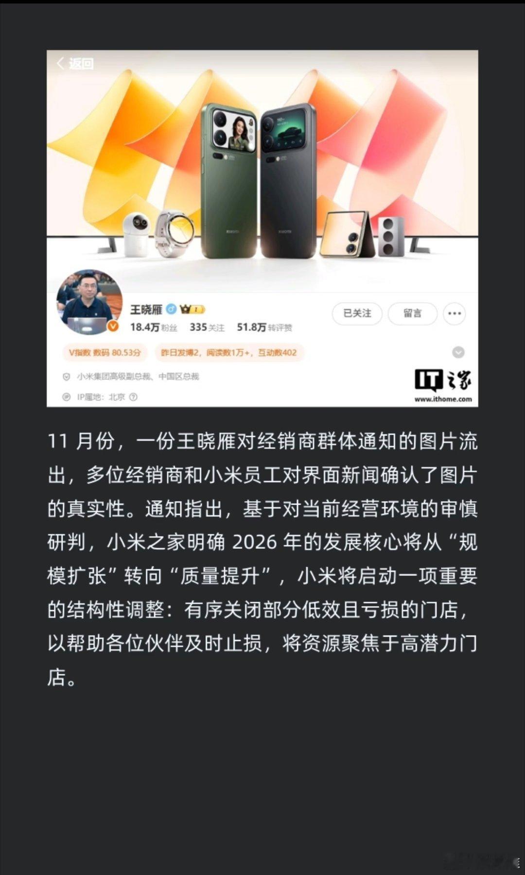 小米将关闭部分低效且亏损门店看了一下小米集团高级副总裁王晓雁的个人履历,他的个人能力还是备受雷军认可的。他曾在中兴任职,早年创办小辣椒手机品牌,年销量曾达800万台并实现盈利;2019年正式加入小米,2022年任小米集团副总裁兼任中国区总裁,2025年6月兼任新零售部小米之家总经理,7月升任小米集团高级副总裁。小米现在的策略是从“规模扩张”转向“质量提升”,在我看来,小米作为一家大企业,能根据市场变化,及时发现问题,并作出策略调整,这是需要勇气和决心的。小米将承担门店调整损失约2726万元科技先锋官