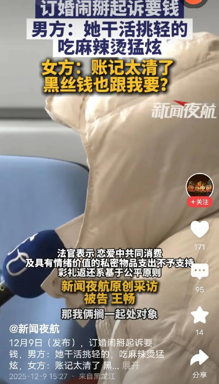 黑龙江哈尔滨,男子和女友订婚给了2万彩礼,谁料,两人同居半年后闹掰了,男子告上法庭,要求女友退还2万彩礼和共同生活支出3万,合计5万元。女友:他太计较了,丁字裤、黑丝袜的钱都要记,我跟他在一起,他没乐呵吗,这个也要算?男子:我家开麻辣烫的,她太能吃了,做的都不够她吃,干活专门挑轻活干。最终,法院判决让男子傻眼。    今年年初,贺先生和同村村民王女士在媒人的撮合下走到一起,两人3月份订婚,订婚当天,贺家给了王家2万块彩礼。 贺先生家是在哈尔滨开麻辣烫的,王女士跟贺先生订婚后就跟他来到哈尔滨,在店里帮忙做工,两人从此同居生活在一起。 一开始小两口相处的还算愉快,你侬我侬,恋爱甜甜蜜蜜。 但是过了两三个月后,贺先生觉得有点不对劲了,他发现,王女士干活的时候专门挑选轻的活干,吃东西吃的特别多,很能吃。 贺先生不干了,他渐渐对王女士失去了信心,也没有了当初的热情。 贺先生的家人也觉得王女士并没有之前说的那么让人满意。 在贺先生一家看来,王女士吃的多,活却干得少,一天就只顾着吃。 渐渐的,贺先生和王女士之间开始出现了争吵,两人隔三差五矛盾不断,你看我不顺眼,我看你不顺眼。 最终,坚持了半年,实在没法过,两人闹掰了,决定分开。 贺先生要求王女士把当初给她的2万块彩礼退回来,而且跟她生活的这半年开销3万元也一并退回来,也就是分开后王女士得还他5万块钱。 王女士一听坚决不干,自己人给他了,活也帮他家干了,还倒贴给他5万,换谁,谁乐意呢? 贺先生也不是吃素的,你不干也行,那就法庭上见呗,看谁有理,于是贺先生把王女士告上法庭,要求她返还5万元。 法庭上,贺先生说,王女士干活的时候,专门挑轻的干,脏活、累活留给他和他的家人,另外,她每天吃麻辣烫,特别能吃,好像我们家做的都不够她吃。 而且,她从上到下,从里到外花的都是我的钱,跟她在一起半年花了3万多块钱。 女子一听瞬间火冒三丈,她说贺先生太斤斤计较了,跟他在一起,买什么东西都要记账,包括内衣、黑丝袜、就连丁字裤都要记在账本上,我买这些跟他在一起,难道他没乐呵吗? 贺先生要求退还3万块开销,王女士更不认可,她说,我们在一起花的钱是共同生活开销,而且这半年内在他家打工难道没有一点功劳吗? 法院审理后认为,俩人处对象的时候一起花的钱,还有那些为了哄彼此开心、有纪念意义的私密东西(比如送的情侣礼物、约会吃饭看电影的开销),男方要是想让女方还,这肯定不支持。 至于彩礼返还的事儿,得按公平原则来判,毕竟彩礼本来就是以结婚为目的给的,现在婚没结成,完全不还或者全还都不合适。 最后经过商量调解,女方和她爸退给男方1万块彩礼钱,男方也答应了,不再追究其他的要求。 其实,这事儿两边都有点“拎不清”。 贺先生家给彩礼本是奔着结婚去的,同居半年闹掰了想要回彩礼能理解。 但连共同生活的麻辣烫、女方买的私密衣物开销都要算进去,确实太斤斤计较,完全没顾及恋爱期间的情分,也没看到女方在店里帮忙的付出。 王女士觉得自己付出了时间和劳力,不愿退钱也情有可原,但如果完全不返还彩礼,也显得不近人情。 毕竟彩礼的核心目的是结婚,婚没结成,适当返还才符合常理。 根据《最高人民法院关于审理涉彩礼纠纷案件适用法律若干问题的规定》第3条规定,人民法院可根据给付财物目的、当地习俗等认定彩礼范围,一方为表达或增进感情的日常消费性支出不属于彩礼。 本案中,贺先生主张返还的3万元共同生活支出,包含同居期间的餐饮消费及女方购买的私密衣物费用,这些均属于恋爱期间的日常消费性支出,并非以结婚为目的的彩礼范畴,因此法院未支持该部分诉求,符合法条对彩礼范围的界定。 不过该规定第六条,双方未办理结婚登记但已共同生活,一方请求返还彩礼的,法院应综合考虑共同生活情况、双方过错等因素确定返还比例。 贺先生与王女士仅订婚未登记结婚,虽共同生活半年,但因矛盾分手,彩礼返还需兼顾公平原则。 法院结合双方共同生活的实际情况、女方曾在麻辣烫店帮忙的付出,未支持全额返还2万元彩礼,最终调解返还1万元,完全契合该法条中“综合考量、合理确定返还比例”的核心精神。 最后,该规定第四条,婚约财产纠纷中,婚约另一方及其实际接收彩礼的父母可以作为共同被告。 本案中,贺家给付的2万元彩礼由女方家庭接收,女方父亲作为共同返还主体参与调解并承担返还责任,既符合农村彩礼给付中常见的父母参与习俗。 同时,也准确适用了该法条关于诉讼主体的规定,确保了彩礼返还责任的全面落实,保障了男方的合法权益。 贺先生这操作属实够奇葩的!同居半年的麻辣烫、女方私密衣物开销都要追着要,算盘打得全村都听见了,完全没点男人的格局。彩礼想退能理解,但连这种鸡毛蒜皮都记账索赔,难怪闹掰,纯属自找难堪!