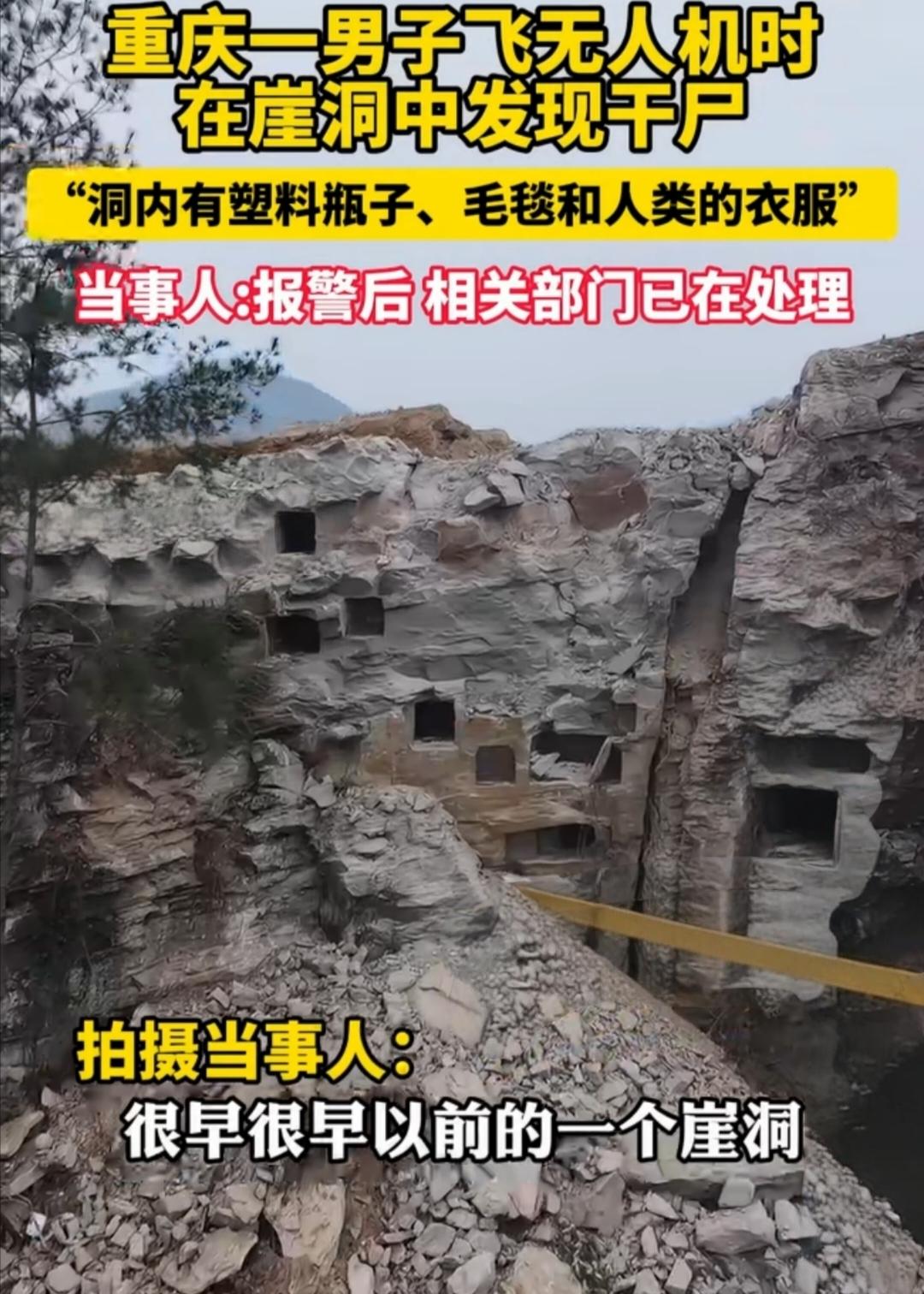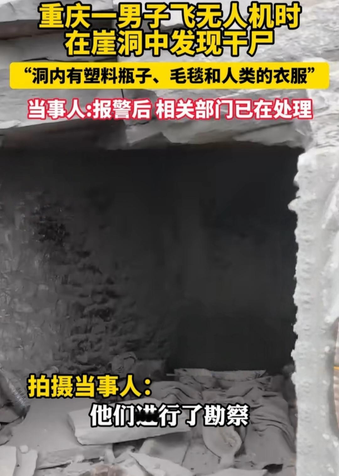 重庆男子飞无人机,崖洞里看见干尸!塑料瓶毛毯都在,吓的赶紧报警。 重庆一男子在郊外飞无人机拍风景,眼瞅着崖壁上有个洞,好奇心上来了,把无人飞过去一看,魂儿差点吓飞了! 只见洞里蜷着具干尸,旁边还扔着塑料瓶、皱巴巴的毛毯,连带着几件看着没烂透的衣服。“这哪是古墓啊,瓶瓶罐罐都是现代玩意儿!”当时给男子后槽牙吓得都打颤,赶紧掏出手机就拨打了110。 等警察和相关部门到了,扒着崖壁往洞里看,也犯了嘀咕:这崖洞是老洞,但这些东西明显是近年留下的。几个人拴着安全绳爬进去勘察,把现场封了个严实。 老哥事后拍腿:“本来想拍点山水发朋友圈,谁能想到撞见这事儿?现在想想还后背发凉。这洞藏得这么偏,要不是无人机飞这么高,指不定啥时候才会有人发现。” 目前这事儿还在调查中,到底是意外滞留还是另有隐情,需等法医和刑警那边出结果。咱就蹲个后续,希望能把这桩怪事的来龙去脉理清楚。无人机 坠落无人机 无人机高空拍景 重庆崖墓