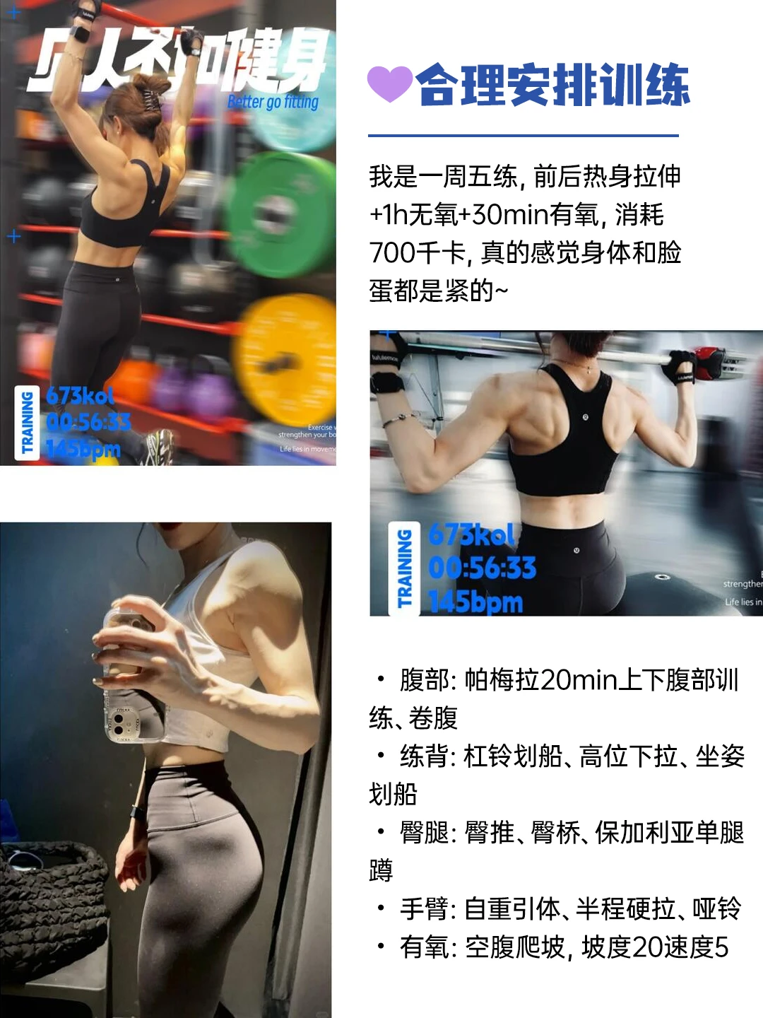 我是一周五练,前后热身拉伸+1h无氧+30min有氧,消耗700千卡,真的感觉身体和脸蛋都是紧的~